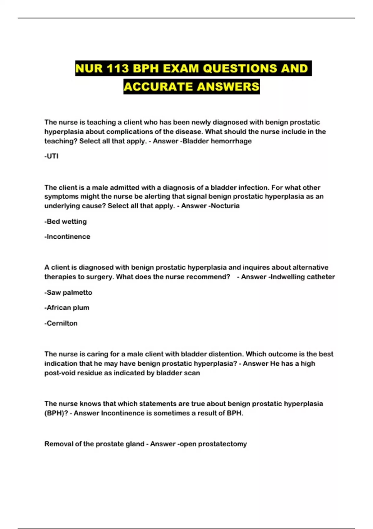 NUR 113 BPH EXAM QUESTIONS AND