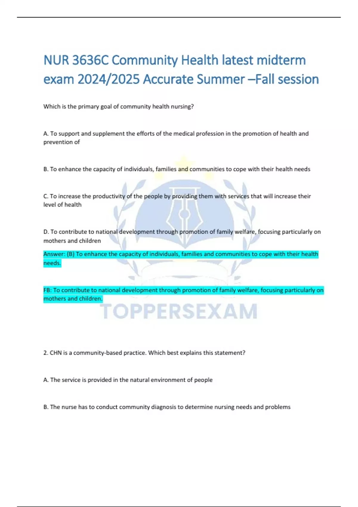 NUR 3636C Community Health latest midterm exam 2024/2025 Accurate Summer –Fall session