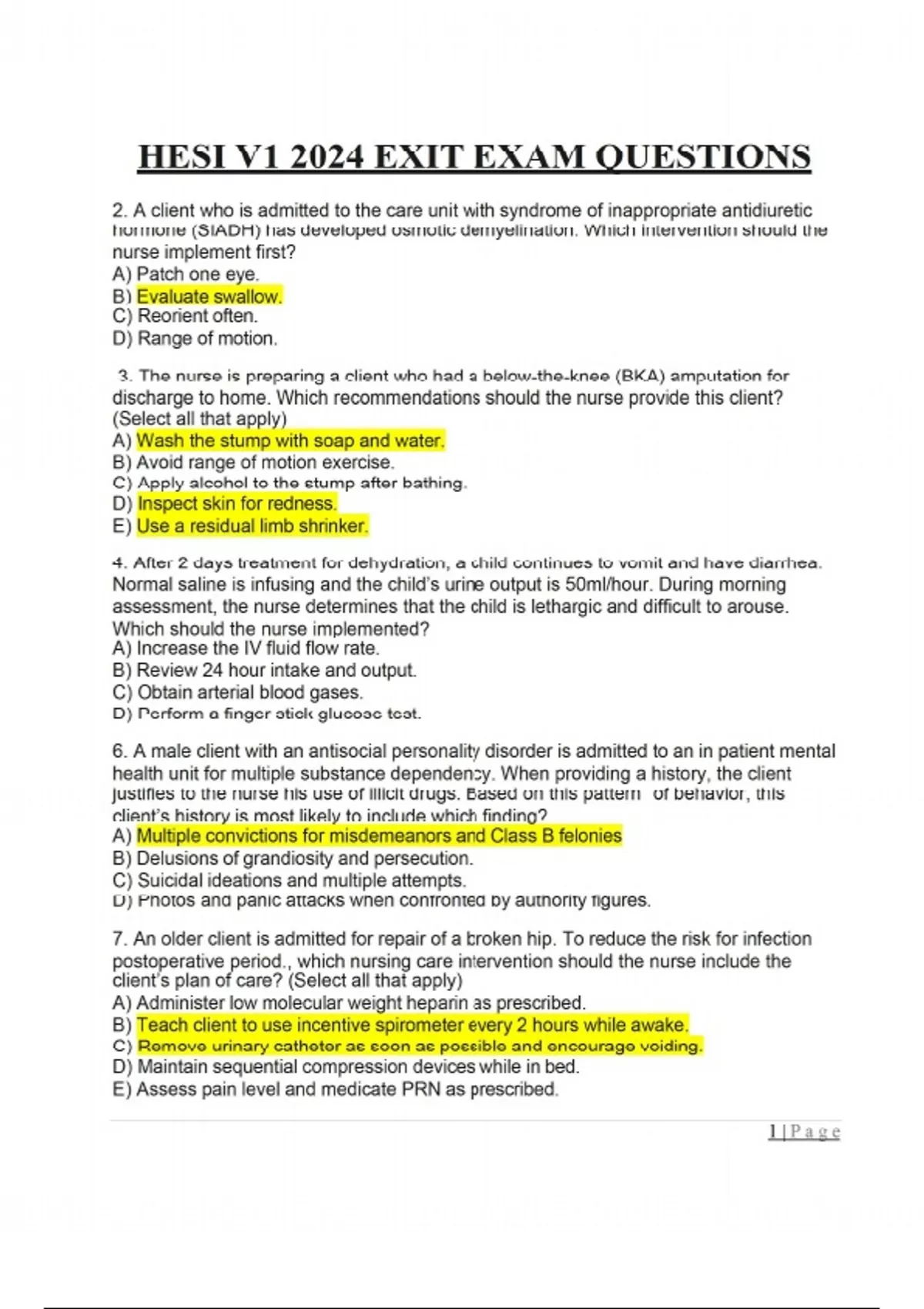 2. A client who is admitted to the care unit with syndrome of inappropriate antidiuretic hormone (SIADH) has developed osmotic demyelination. Which intervention should the nurse implement first? A) Patch one eye. B) Evaluate swallow. C) Reorient often. D) Range of motion. 3. The nurse is preparing a client who had a below-the-knee (BKA) amputation for discharge to home. Which recommendations should the nurse provide this client? (Select all that apply) A) Wash the stump with soap and water. B) Avoid range of motion exercise. C) Apply alcohol to the stump after bathing. D) Inspect skin for redness. E) Use a residual limb shrinker. 4. After 2 days treatment for dehydration, a child continues to vomit and have diarrhea. Normal saline is infusing and the child’s urine output is 50ml/hour. During morning assessment, the nurse determines that the child is lethargic and difficult to arouse. Which should the nurse implemented? A) Increase the IV fluid flow rate. B) Review 24 hour intake and output. C) Obtain arterial blood gases. D) Perform a finger stick glucose test. 6. A male client with an antisocial personality disorder is admitted to an in patient mental health unit for multiple substance dependency. When providing a history, the client justifies to the nurse his use of illicit drugs. Based on this pattern of behavior, this client’s history is most likely to include which finding? A) Multiple convictions for misdemeanors and Class B felonies B) Delusions of grandiosity and persecution. C) Suicidal ideations and multiple attempts. D) Photos and panic attacks when confronted by authority figures. 7. An older client is admitted for repair of a broken hip. To reduce the risk for infection postoperative period., which nursing care intervention should the nurse include the client’s plan of care? (Select all that apply) A) Administer low molecular weight heparin as prescribed. B) Teach client to use incentive spirometer every 2 hours while awake. C) Remove urinary catheter as soon as possible and encourage voiding. D) Maintain sequential compression devices while in bed. E) Assess pain level and medicate PRN as prescribed. 1 | P a g e 9. A client with arthritis has been receiving treatment with naproxen and now reports ongoing stomach pain, increasing weakness, and fatigue. Which laboratory test should the nurse monitor? A) Serum Calcium. B) Erythrocyte sedimentation rate. C) Osmolality. D) Hemoglobin. 10. A client with bacterial meningitis is receiving phenytoin. Which assessment finding indication to the nurse that the client is experiencing a therapeutic response to the phenytoin? A) Increased time of ambulation between periods of rest. B) Decrease in intracranial pressure and cerebral edema. C) Absence of seizure activity for the duration of treatment. D) Normal electroencephalogram after drug administration. 11. A client peptic ulcer disease receives a prescription for intermittent suction via a SalemSump nasogastric tube (NGT). After inserting the NGT and obtaining coffee- ground gastric contents, the nurse clamps the NGT because the client must leave the unit for diagnostic studies. Upon return to the unit, the client complains of nausea. What action should the nurse implement first? A) Administering a prescribed antiemetic agent. B) Provide oral suction using a Yankauer tip. C) Connect the NGT to low intermittent suction. D) Irrigate the NGT with sterile normal saline. 12. The healthcare provider prescribes a fluid challenge of 0.9% sodium chloride 1,000 ml to be influenced over 4 hours. The IV administration set delivers 10 gtt/ml. How many gtt/minute should the nurse regulate the infusion? ( round the nearest whole number.) 13. A family member reports that the client who is bedridden has not been turned or repositioned all night and is sleeping on a special air mattress with no sheets. What information should the nurse provide to the family member? A) Clarify that an aerated support surface does not use sheets that often cause skin breakdown. B) Described the night staff’s plan of care to ensure the client’s sleep is not disturbed. C) Explained that turning is only necessary to reposition the client during waking hours. D) Suggest that a family member turn the client during the night when someone is there. 15. A client with bleeding esophageal varies receives vasopressin IV. What should the nurse monitor for during the IV infusion of this medication? A) Vasodilation of the extremities. B) Chest pain and dysrhythmia. C) Hypotension and tachycardia. D) Decreasing GI cramping and nausea.