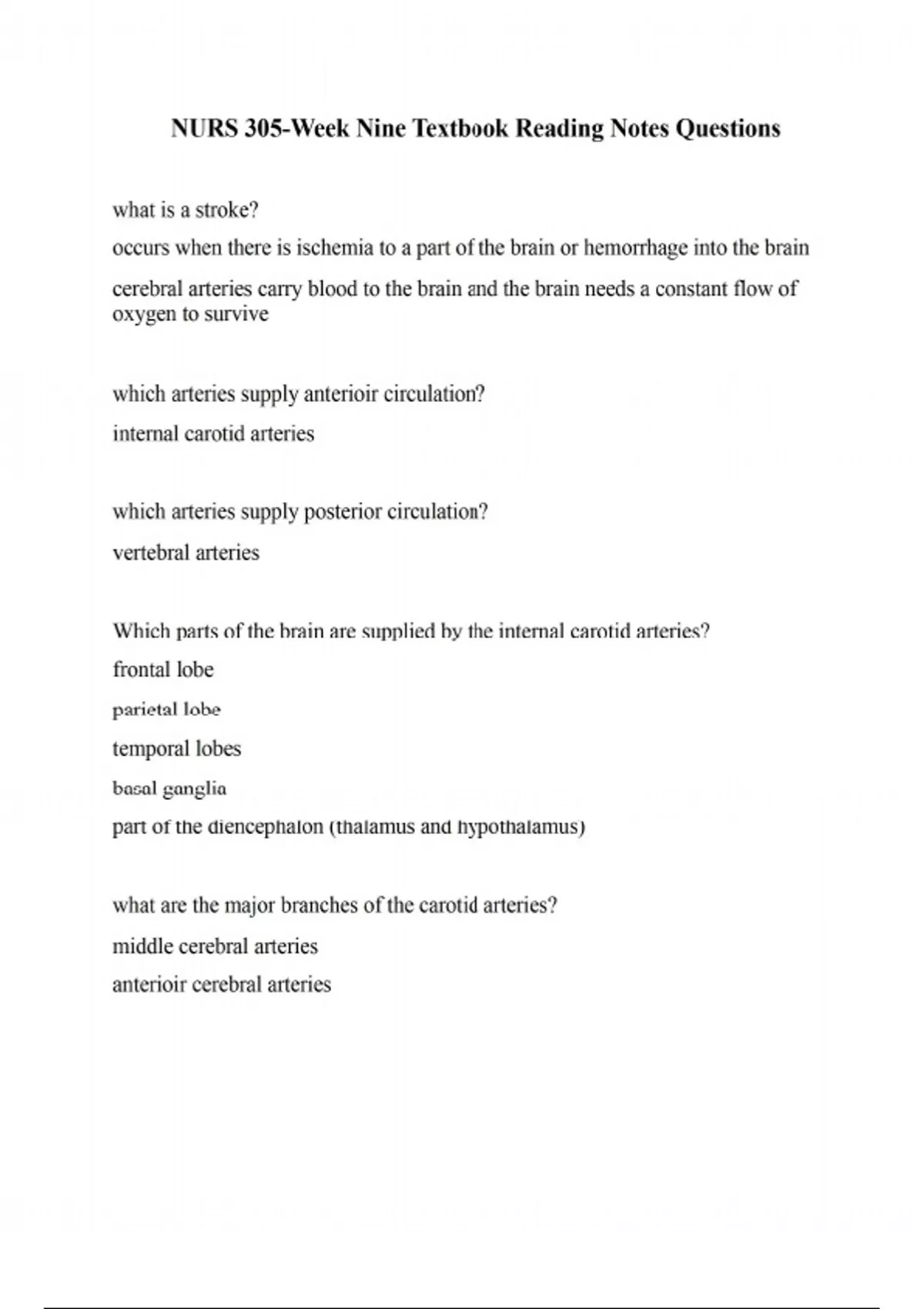 what is a stroke? occurs when there is ischemia to a part of the brain or hemorrhage into the brain cerebral arteries carry blood to the brain and the brain needs a constant flow of oxygen to survive which arteries supply anterioir circulation? internal carotid arteries which arteries supply posterior circulation? vertebral arteries Which parts of the brain are supplied by the internal carotid arteries? frontal lobe parietal lobe temporal lobes basal ganglia part of the diencephalon (thalamus and hypothalamus) what are the major branches of the carotid arteries? middle cerebral arteries anterioir cerebral arteries the vertebral arteries join to form the basilar artery which branches to supply which part of the brain? middle and lower parts of temporal lobe occipital lobes cerebellum brainstem part of the diencephalon What is the main branch of the basilar artery? posterior cerebral artery image to help learn (WARNING THIS IMAGE MAKES ME SO NAUSEOUS) Where is anterioir and posterioir circulation connected? at the circle of willis by the anterior and posterioir communicating arteries What is cerebral autoregulation? The mechanism by which the brain protects itself from changes in MAP by vasodilation and constriction. what are some factors that affect blood flow to the brain? systemic BP cardiac output blood viscosity DID YOU KNOW THE CEREBRAL ARTERIES CAN ALSO GET ATHEROSCLEROSIS? ITS THE EXACT SAME AS ATHEROSCLEROSIS IN THE HEART SO JUST MAKE SURE U KNOW IT FROM THAT AND YOU CAN TRANSFER THAT THINKING What is the ischemic cascade? Ishcemia--> Metabolic changes--> Diastolic dysfucntion-->Systolic dysfunction-- >Ekg changes-->chest pain what is penumbra? around the core area of ischemia and is a border zone where ischemia can potentially be reversed If adequate blood flow can be resored in _____ hours and the ischemic cascade can be interrupted, brain damage may be minimized and less neurological function may be lost. 3 hours What are some Nonmodifiable risk factors of stroke? age sex indigenous, african, south asian heritage family and medical history personal circumstances (access to safe drinking water) What is an arteriovenous malformation? an abnormal group of tangled arteries and veins AVMs can occur anywhere in the body but pose the greatest risk in the brain What are some modifiable risk factors of stroke? hypertension heart disease (Afib, MI, cardiomypathy, cardiac valve abnormalities) diabetes mellitus increased serum cholesterol levels and carotid stenosis birth control pills (progestin and estrogen) use of illicit drugs obesity What is an ischemic stroke? result from inadequate blood flow to the brain from partial or complete occlusion of an artery and account for the majority of strokes What are the two types of ischemic strokes? thrombotic embolic What is a transient ischemic attack? a temporary episode of neurological dysfunction caused by focal brain, spinal cord, or retinal ischemia but without acute infarction of the brain What are some causes of TIAs? microemboli or plaque that temporariy block blood flow TIAs are a warning sign of cerebrovascular disease what does dysarthia mean? disturbance in the muscular control of spech What is a thrombotic stroke? occurs when a blood clot forms in a diseased and narrowed blood vessel in the brain if the narrowed part of the lumen becomes occluded infarction occurs thrombosis often occurs in areas of narrowed blood vessels What is a lacunar stroke? a stroke from occlusion of a small penetrating artery that supplies blood to tissue deep within the brain (typically occurs in basal gangllia, thalamus) What is an embolic stroke? occurs when an embolus lodges in and occludes a cerebral artery resulting in infarction and edema of the area supplied by the involved vessel What are some of the clinical symptoms someone experiencing an embolic stroke might have? they will have a raoud occurence of severe clinical symptoms the patient usually remains conscious may or may not experience a headache