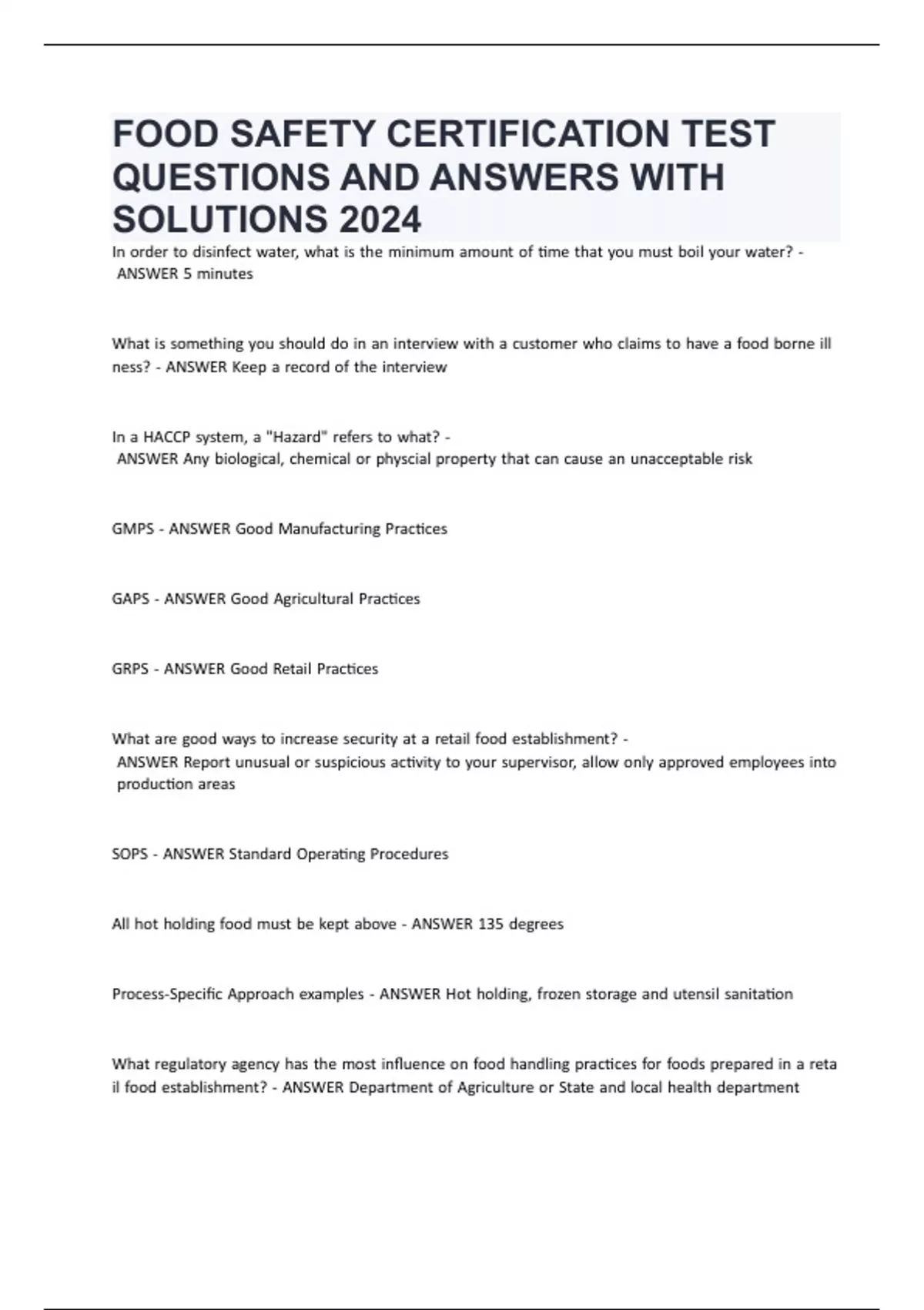 FOOD SAFETY CERTIFICATION TEST QUESTIONS AND ANSWERS WITH SOLUTIONS 2024