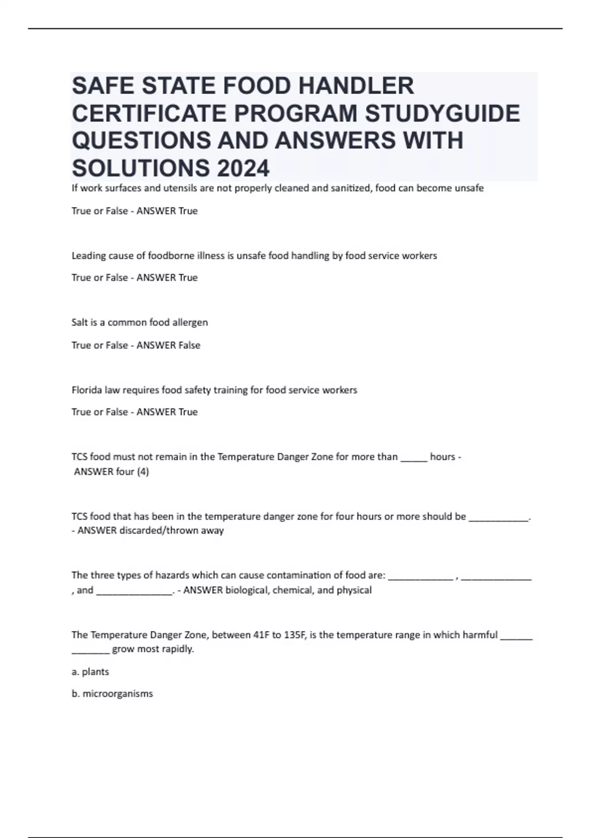 SAFE STATE FOOD HANDLER CERTIFICATE PROGRAM STUDYGUIDE QUESTIONS AND ANSWERS WITH SOLUTIONS 2024