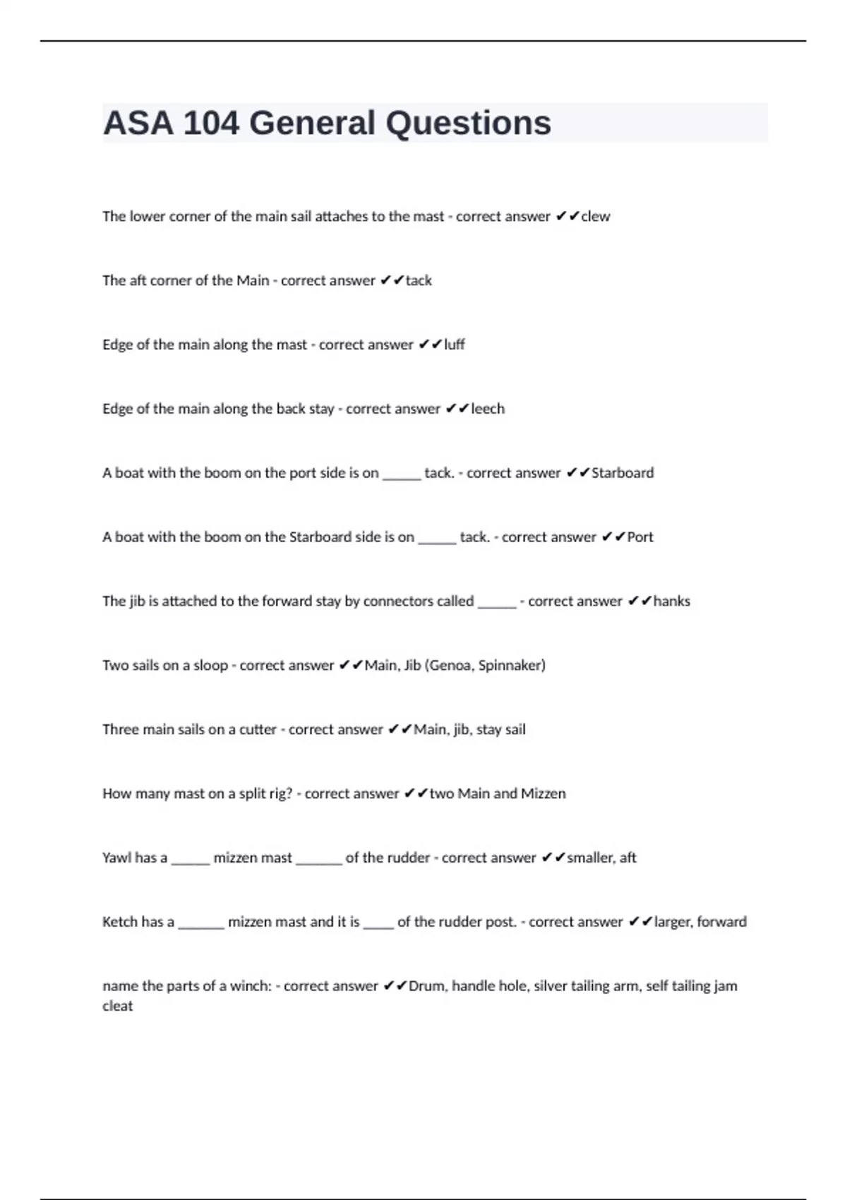 The lower corner of the main sail attaches to the mast - correct answer ✔✔clew
