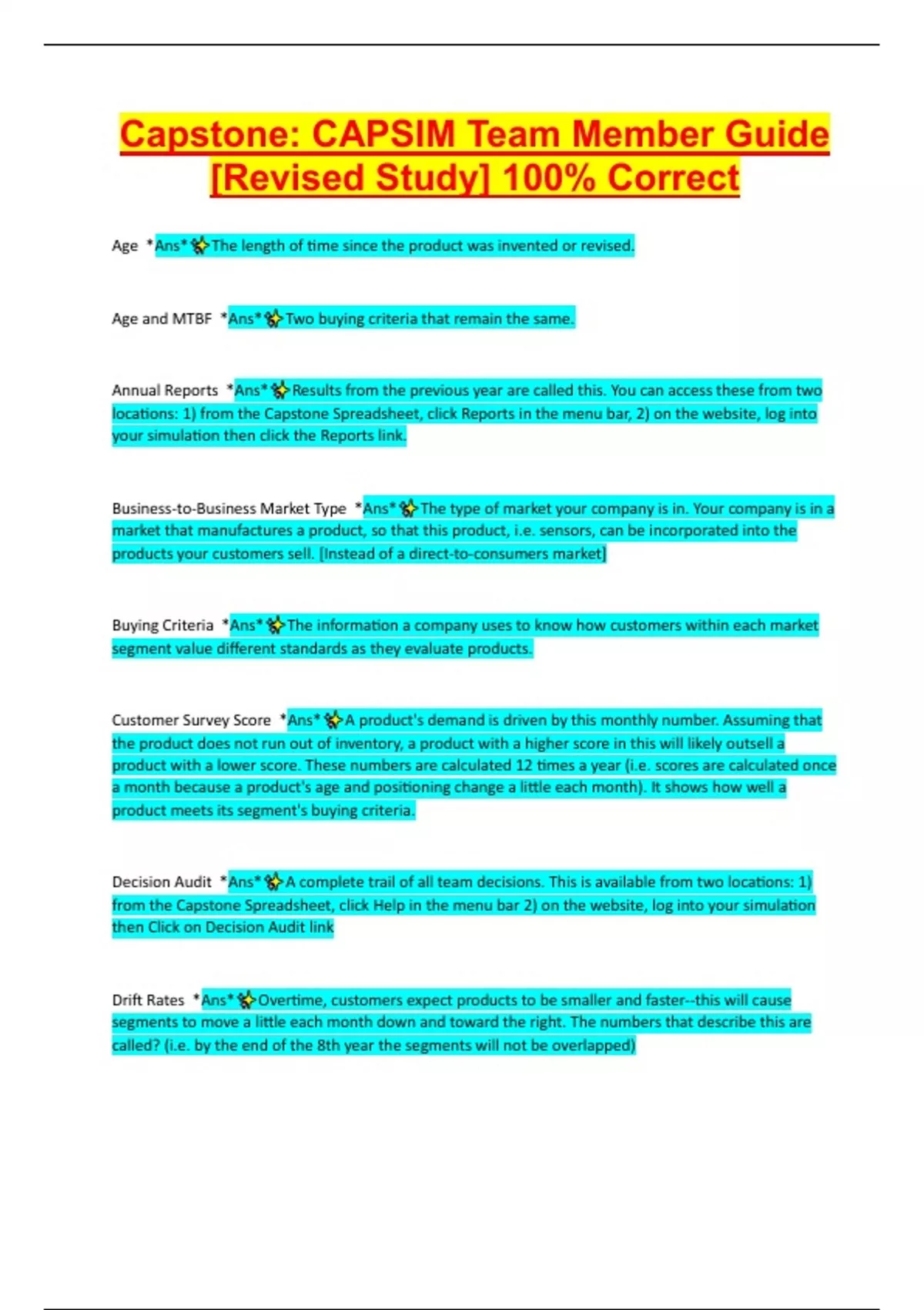 Capstone: CAPSIM Team Member Guide [Revised Study] 100% Correct Age *Ans* The length of time since the product was invented or revised. Age and MTBF *Ans* Two buying criteria that remain the same. Annual Reports *Ans* Results from the previous year are called this. You can access these from two locations: 1) from the Capstone Spreadsheet, click Reports in the menu bar, 2) on the website, log into your simulation then click the Reports link. Business-to-Business Market Type *Ans* The type of market your company is in. Your company is in a market that manufactures a product, so that this product, i.e. sensors, can be incorporated into the products your customers sell. [Instead of a direct-to-consumers market] Buying Criteria *Ans* The information a company uses to know how customers within each market segment value different standards as they evaluate products. Customer Survey Score *Ans* A product's demand is driven by this monthly number. Assuming that the product does not run out of inventory, a product with a higher score in this will likely outsell a product with a lower score. These numbers are calculated 12 times a year (i.e. scores are calculated once a month because a product's age and positioning change a little each month). It shows how well a product meets its segment's buying criteria. Decision Audit *Ans* A complete trail of all team decisions. This is available from two locations: 1) from the Capstone Spreadsheet, click Help in the menu bar 2) on the website, log into your simulation then Click on Decision Audit link Drift Rates *Ans* Overtime, customers expect products to be smaller and faster--this will cause segments to move a little each month down and toward the right. The numbers that describe this are called? (i.e. by the end of the 8th year the segments will not be overlapped) These are usually located in the Industry Conditions Report. Finance Department *Ans* This department can raise money via one-year bank notes, 10 year bonds, or through stock issues. This department can also issue stock dividends, buy back stock, or retire bonds before their due dates. Fine Cut Circle *Ans* The solid inner circle that defines the heart of the segment. Often customers prefer products within this circle. These circles have a radius of 2.5 units. Four Main Departments *Ans* 1.) Research & Development, 2) Marketing, 3) Production, 4) Finance (Companies use the Capstone Spreadsheet to enter departmental decisions) High End Segment *Ans* This segment describes products that are fast in performance and smaller in size. (i.e. products of this type fall inside the lower-right set of dashed and solid circles) Industry Conditions Report *Ans* Lists market segment sales percentages and projected growth rates. It is published once at the beginning of the simulation- and it is available in the Dashboard. Industry Conditions Report *Ans* Outlines the beginning business environment, including customer buying criteria. This report is available from your simulation Dashboard. Inter-Department Coordination between Finance and Production Departments *Ans* Production tells Finance if it needs money for additional equipment [If Finance cannot raise enough money, Production must scale back or perhaps sell idle inventory] Inter-Department Coordination between Marketing and Finance Departments *Ans