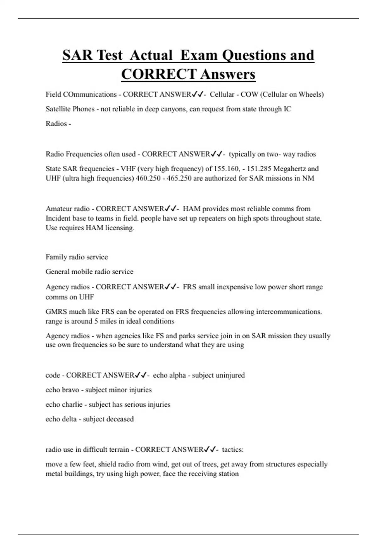 SAR Test Actual Exam Questions and CORRECT Answers Field COmmunications - CORRECT ANSWER- Cellular - COW (Cellular on Wheels) Satellite Phones - not reliable in deep canyons, can request from state through IC Radios - Radio Frequencies often used - CORRECT ANSWER- typically on two- way radios State SAR frequencies - VHF (very high frequency) of 155.160, - 151.285 Megahertz and UHF (ultra high frequencies) 460.250 - 465.250 are authorized for SAR missions in NM
