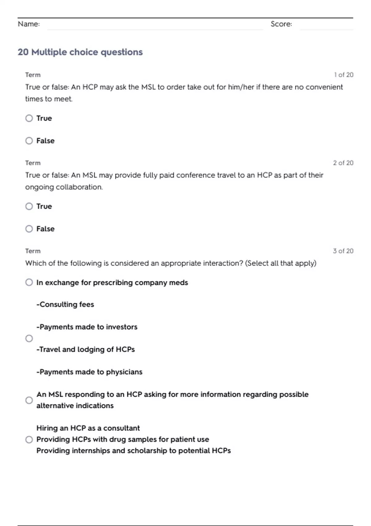 20 Multiple choice questions