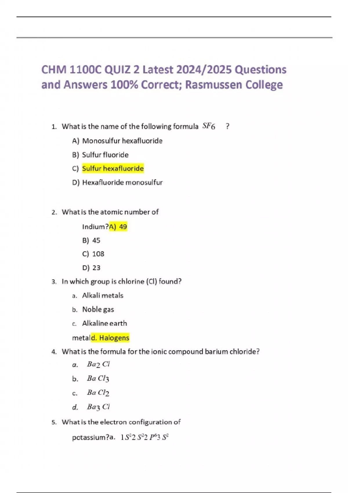 CHM 1100C QUIZ 2 Latest 2024/2025 Questions and Answers 100% Correct; Rasmussen College CHM 1100C QUIZ 2 Latest 2024/2025 Questions and Answers 100% Correct; Rasmussen College 1. What is the name of the following formula SF6 ? A) Monosulfur hexafluoride B) Sulfur fluoride C) Sulfur hexafluoride D) Hexafluoride monosulfur 2. What is the atomic number of Indium? A) 49 B) 45 C) 108 D) 23 3. In which group is chlorine (Cl) found? a. Alkali metals b. Noble gas c. Alkaline earth metal d. Halogens 4. What is the formula for the ionic compound barium chloride? a. Ba2 Cl b. Ba Cl3 c. Ba Cl2 d. Ba3 Cl 5. What is the electron configuration of potassium? a. 1 S22 S22 P63 S2 b. 1 S22 S22 P63 S2 3 P6 4 S1 c. 1 S22 S22 P63 S2 3 P5 d. 1 S22 S22 P63 S2 3 S23 P6 4 S2 6. How many electrons must Iodine gain to become like its closest noble gas Xenon? a. 3 b. 4 c. 2 d. 1 7. Ionization energy going up a group and going from right to left in a period. a. Increases; decreases b. Increases; increases c. Decreases; decreases d. Decreases; increases 8. As an electron falls back to ground state, it emits a of light. a. Spectrum b. Energy level c. Photon d. Quantum number 9. Which of the following is NOT one of the three parts to Dalton’s atomic theory? a. Atoms are not distinguishable from one another b. Elements are comprised of atoms, which are tiny indestructible particles c. When atoms combine to form compounds, they combine in simple whole number ratios d. All atoms of a specific element have the same mass and properties that distinguish them from atoms of another element 10. One the periodic table, atomic size from left to right across the periods and going down a group. a. Increases; decreases b. Decreases; increases c. Decreases; decreases d. Increases; increases 11. How many electrons does calcium lose to become an ion? a. 2 b. 4 c. 3 d. 1 12. Match the formula with the names of following polyatomic ions. −¿ a. Acetate NO¿ −¿ b. Phosphate C2 H 3 2 c. Cyanide d. Nitrite 3−¿ PO¿ −¿ C N¿ e. Ammonium −¿ N H ¿ 13. What is the correct order of increasing ( shortest to longest) wavelengths of electromagnetic radiation? a. Infrared, gamma rays, visible light, microwaves b. Microwaves, infrared light, visible light, gamma rays c. Gamma rays, microwaves, visible light, infrared light d. Gamma rays, visible light, infrared light, microwaves 14. What is the atomic mass of copper with isotopes copper – 63 with a mass of 62.930 and copper – 65 with a mass of 64.928 and abundances of 69.17% and 30.83% respectively. a. 63.546 amu b. 64.312 amu c. 62.930 amu d. 64.928 amu 15. What element has the symbol Au? a. Silver b. Americium c. Gold d. Copper 16. Metallic character going down a group and going from right to left across a period. a. Increases; increases b. Increases; decreases c. Decreases; decreases d. Decreases; increases 17. Whose gold foil experiment lead to the nuclear theory of the atom? a. J.J Thomson b. Albert Einstein c. Linus Pauling d. Ernest Rutherford 18. The mass number for carbon is 13. How many protons and neutrons does the isotope contain? a. Protons – 6 ; Neutrons – 8 b. Protons – 6 ; Neutrons – 7 c. Protons – 6 ; Neutrons – 6 d. Protons – 6 ; Neutrons – 3 19. What element has the symbol Es? a. Europium b. Terbium c. Fermium d. Einsteinium 20. What is the correct order of types of electromagnetic radiation for increasing energy per photon? a. Infrared light, gamma rays, visible light, microwaves b. Microwaves, infrared light, visible light, gamma rays c. Gamma rays, microwaves, visible light, infrared light d. Gamma rays, visible light, infrared light, microwaves 21. What is the atomic number for Cesium? a. 55 b. 93 c. 62 d. 89 22. Will Sulfur become a positively charged cation or a negatively charged anion? a. Anion b. Neither c. Cation d. Both 23. How many protons does oxygen- 17 contain? a. 4 b. 9 c. 8 d. 7 24. What is the atomic symbol for Yttrium? a. Mg b. Zr c. Y d. W 25. How many neutrons are contained in magnesium – 25? a. 13 b. 10 c. 14 d. 12 26. Who is credited with the organization of the periodic table? a. Clemens Winkler b. Ernest Rutherford c. Dmitri Mendeleev d. J. J. Thomas 27. What is the correct order of increasing frequency of electromagnetic radiation? a. Gamma rays, visible light, infrared light, microwaves b. Infrared light, gamma rays, visible light, microwaves c. Gamma rays, microwaves, visible light, infrared light d. Microwaves, infrared light, visible light, gamma rays 28. What are valence electrons? a. The number of protons in an atom b. The number of electrons gained by an atom c. The outermost electrons found in an atom d. The number of electrons lost by an atom 29. An electron is to a higher energy level. The electron falls back or it to a lower energy level. a. Excited; relaxed b. Quantized; emits c. Emits; quantizes d. Relaxed; excited 30. How many valence electrons does aluminum (Al) have? a. 2 b. 4 c. 1 d. 3 31. What is the mass ratio of ammonia ( NH )? a. 4.7: 1 b. 6.0: 1 c. 0.21: 1 d. 4: 1 32. What is the name of the ionic compound CuCl? a. Copper(l) Chloride b. Copper(ll) Chlorine c. Copper(ll) Chloride d. Copper(l) Chlorine 33. How many valence electrons does nitrogen (N) contain? a. 4 b. 8 c. 2 d. 5 34. In which family is potassium (k) found? a. Alkaline earth metals b. Alkali metals c. Halogens d. Noble gases 35. Chlorine has two naturally occurring isotopes: Chlorine – 35 and Chlorine – 37. What is the symbol for each of these Chlorine isotopes? 35 a. 17 Cl and 35 b. 17 Cl and 35 c. 1 8 Cl and 35 d. 1 5 Cl and 3 7 15 Cl 37 1 7 Cl 37 17 Cl 37 1 8 Cl 36. What is the atomic ratio of nitrogen-to- hydrogen in ammonia ( NH¿ ? a. 3:1 b. 1:2 c. 2:1 d. 1:3