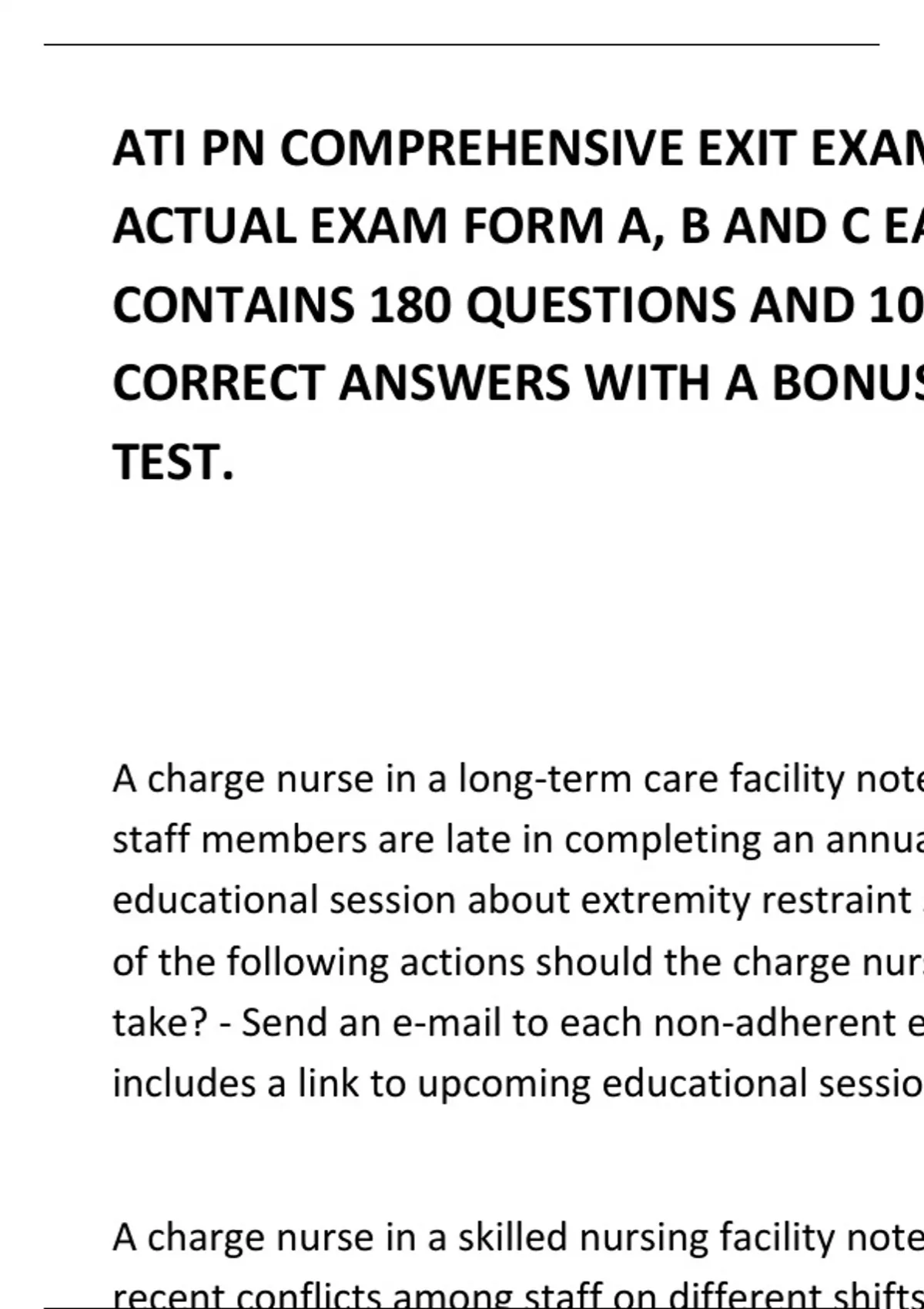 ATI PN COMPREHENSIVE EXIT EXAM LATEST ACTUAL EXAM FORM A, B AND C EACH CONTAINS 180 QUESTIONS AND 100% CORRECT ANSWERS WITH A BONUS PRACTICE TEST. A charge nurse in a long-term care facility notes that several staff members are late in completing an annual mandatory educational session about extremity restraint safety. Which of the following actions should the charge nurse plan to take? - Send an e-mail to each non-adherent employee that includes a link to upcoming educational sessions. A charge nurse in a skilled nursing facility notes several recent conflicts among staff on different shifts. Which of the following strategies should the charge nurse plan to use to resolve these conflicts? - Set up a series of meetings for all staff members to attend to discuss issues. A charge nurse is coordinating the evacuation of clients from a facility following a bomb threat. Which of the following actions should the nurse take when implementing the evacuation process? - Instruct clients who are able to ambulate to leave A client at a routine prenatal care visit asks the nurse if it is common to develop vaginal yeast infections during pregnancy. Which of the following responses should the nurse make? - "The hormonal changes of pregnancy change the acidity of the vagina, making yeast infections more common." A community health nurse is contributing to the plan of care for four high-risk newborns who were discharged yesterday. Which of the following newborns should the nurse recommend to care for the first? - A 4-day-old newborn who has an elevated bilirubin level and requires photo-therapy A female client who has recurrent cystitis asks the nurse about preventing future episodes. For which of the following statements should the nurse provide further reinforcement of teaching? - "I prefer tub baths to showering." A health care facility's leadership team is implementing a new computerized charting system. Before the implementation date, which of the following actions should the charge nurse take first? - Collect the staff's input about planning and implementing the change A hospice nurse is visiting with the family member of a client. The family member states that the client has insomnia almost nightly. Which of the following practices should the nurse identify as contributing to the client's insomnia? - The client watches television in her bed during the day. A new resident provider asks the nurse for an access code to review a client's online record. The resident is not scheduled to attend the facility's orientation computer class until next week. Which of the following actions should the nurse take? - Explain that it is against policy to share access codes and refer the resident to his supervisor A newly licensed nurse in an urgent care center is caring for a child who has bruises that the nurse suspects are due to child abuse. Which of the following actions should the nurse take? - Report the suspected abuse to local authorities. A nurse at a family planning clinic is preparing to give a presentation to clients about how to use a diaphragm. Which of the following information should the nurse plan to include in the session? - "Use spermicidal jelly whenever you use your diaphragm." A nurse at a long-term care facility hears an assistive personnel (AP) talking with an older adult client who has dementia with periods of confusion. Which of the following statements indicates that the AP requires further instructions? - "It's almost time for your appointment..Let me do your hair for you and brush your teeth." A nurse at a long-term care facility notes that a client who has dementia is having problems with orientation. Which of the following actions should the nurse take to improve the client's level of orientation? - Post a large calendar on the bulletin board A nurse delegates newly licensed nurse to provide one-onone observation for a client who requires suicide precautions. Which of the following actions by the newly licensed nurse indicates the need for further reinforcement of teaching? - Ambulates the client's roommate while the client sleeps. A nurse i reinforcing teaching with a client who has hyperthyroidism about managing this disorder. Which of the following recommendations should the nurse include? - Increase her caloric intake with meals A nurse in a long-term care facility for a group of clients. One of the client's is walking in the hallway and bumping into walls and does not respond to his name. Which of the following actions should the nurse take? - Accompany the client back to his room. A nurse in a prenatal clinic is collecting data from several clients. Which of the following client reports should the nurse identify as an expected physiologic adaptation of pregnancy? - Breast tenderness A nurse in a provider's office is talking with an older adult client who reports having trouble sleeping. Which of the following statements should the nurse identify as a possible cause for the client's sleeping difficulties? - "I often have a cup of coffee with my dessert before going to bed." A nurse in a rehabilitation facility is observing an assistive personnel (AP) help a client transfer from the bed to a wheelchair.