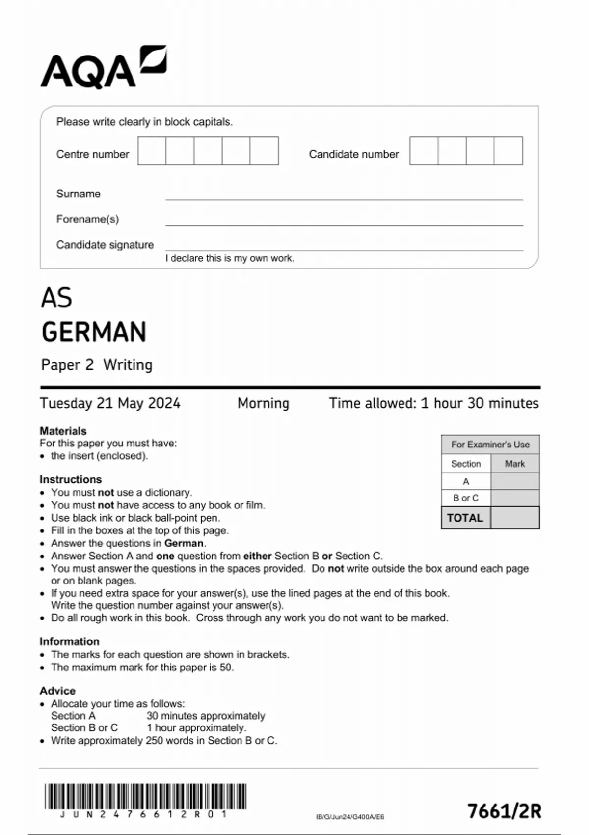 AQA AS GERMAN PAPER 2 2024 (7661/2: Writing)
