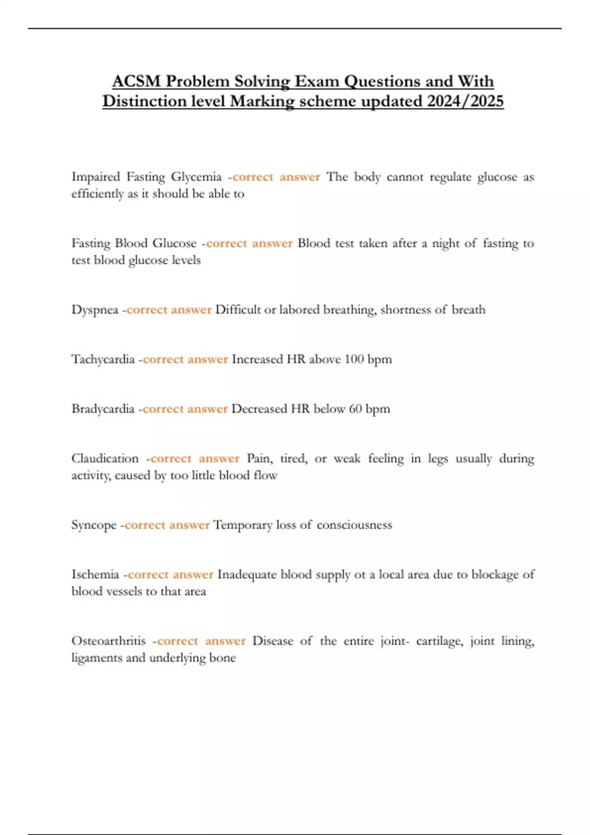 ACSM Problem Solving Exam Questions and With Distinction level Marking scheme updated 2024/2025 Impaired Fasting Glycemia -correct answer The body cannot regulate glucose as efficiently as it should be able to Fasting Blood Glucose -correct answer Blood test taken after a night of fasting to test blood glucose levels Dyspnea -correct answer Difficult or labored breathing, shortness of breath Tachycardia -correct answer Increased HR above 100 bpm Bradycardia -correct answer Decreased HR below 60 bpm Claudication -correct answer Pain, tired, or weak feeling in legs usually during activity, caused by too little blood flow Syncope -correct answer Temporary loss of consciousness Ischemia -correct answer Inadequate blood supply ot a local area due to blockage of blood vessels to that area Osteoarthritis -correct answer Disease of the entire joint- cartilage, joint lining, ligaments and underlying bone Rheumatoid arthritis -correct answer immune system attacks your joints and causes inflammation to joints and organs Orthopnea -correct answer Discomfort in breathing that is relieved by sitting or standing in an erect position Emphysema -correct answer Lung disease that makes it hard to breathe Hypoglycemia -correct answer Low blood glucose below 70mg/dl Android obesity -correct answer Fat in trunk area