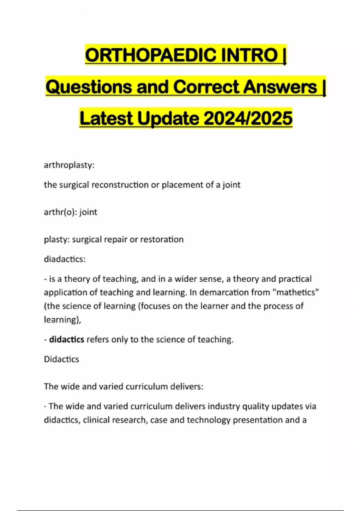 ORTHOPAEDIC INTRO | Questions and Correct Answers | Latest Update 2024/2025 arthroplasty: the surgical reconstruction or placement of a joint arthr(o): joint plasty: surgical repair or restoration diadactics: - is a theory of teaching, and in a wider sense, a theory and practical application of teaching and learning. In demarcation from "mathetics" (the science of learning (focuses on the learner and the process of learning), - didactics refers only to the science of teaching. Didactics The wide and varied curriculum delivers: · The wide and varied curriculum delivers industry quality updates via didactics, clinical research, case and technology presentation and amultidisciplinary team of Spine, Orthopaedic Reconstruction & Trauma instructors. Two main objectives to completing this pre-study module: 1. Review your course documents, syllabus, classroom policies, and schedule. 2. Familiarize yourself with basic Orthopaedic terminology, skeletal anatomy, anatomical planes, and clinical literature prior to the course beginning. Orthopaedics: · Revolution of innovation in the last 45