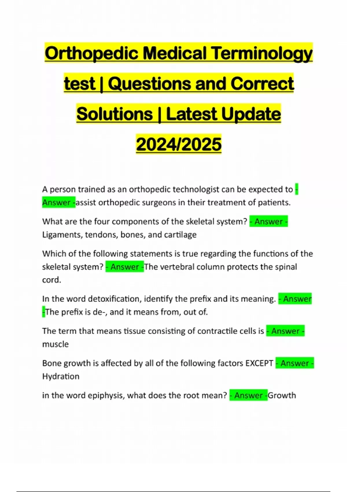 Orthopedic Medical Terminology test | Questions and Correct Solutions | Latest Update 2024/2025 A person trained as an orthopedic technologist can be expected to - Answer -assist orthopedic surgeons in their treatment of patients. What are the four components of the skeletal system? - Answer - Ligaments, tendons, bones, and cartilage Which of the following statements is true regarding the functions of the skeletal system? - Answer -The vertebral column protects the spinal cord. In the word detoxification, identify the prefix and its meaning. - Answer -The prefix is de-, and it means from, out of. The term that means tissue consisting of contractile cells is - Answer - muscle Bone growth is affected by all of the following factors EXCEPT - Answer - Hydration in the word epiphysis, what does the root mean? - Answer -GrowthWhich of the following words refers to the fatty, blood-forming tissue in the cavities of long bones? - Answer -Marrow What is the plural form of the medical term that refers to one of the bones of the spinal column? - Answer -Vetebrae Which of the following terms, meaning the specialty concerned with the diagnosis and treatment of disorders and injuries to the foot, is spelled correctly? - Answer -Podiatry In the term periosteum, identify the prefix and its meaning - Answer - The prefix is peri-, and the term means around. What is the name of the bone that articulates with the tibia to form the ankle joint? - Answer -Talus