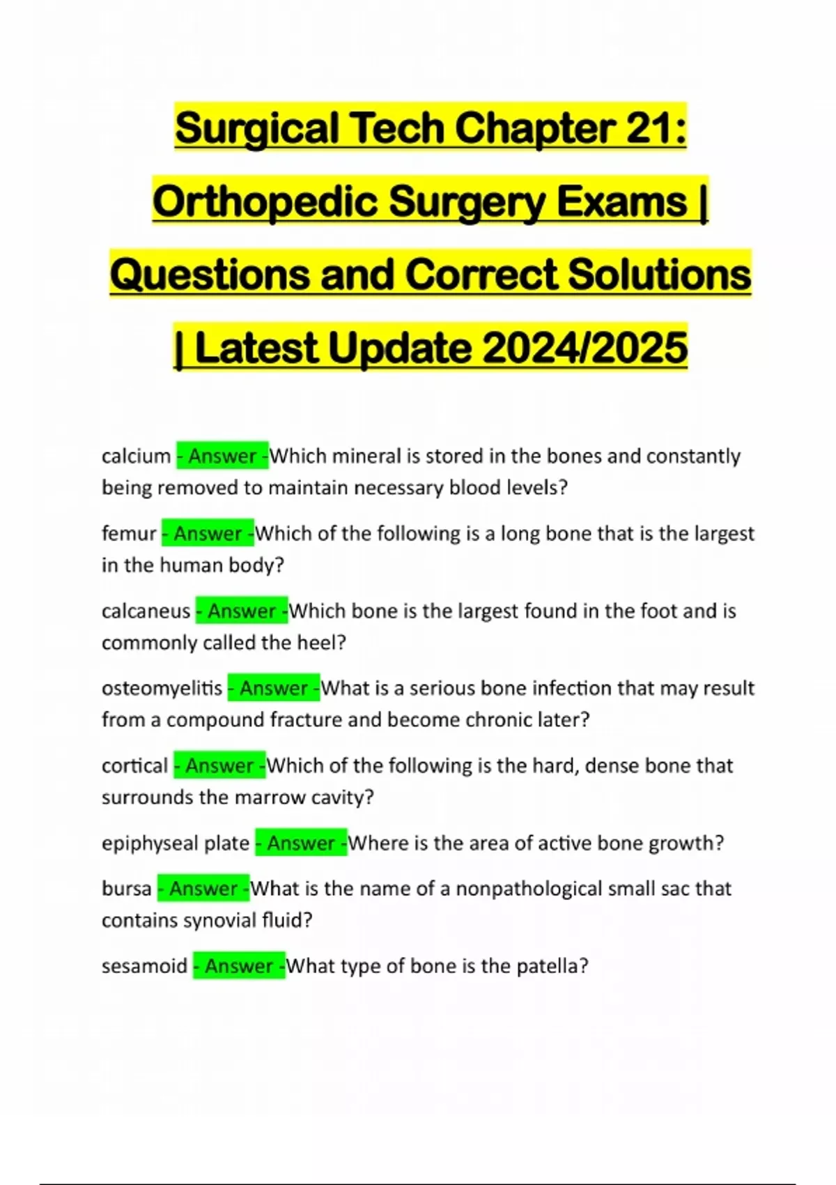 Surgical Tech Chapter 21: Orthopedic Surgery Exams | Questions and Correct Solutions | Latest Update 2024/2025 calcium - Answer -Which mineral is stored in the bones and constantly being removed to maintain necessary blood levels? femur - Answer -Which of the following is a long bone that is the largest in the human body? calcaneus - Answer -Which bone is the largest found in the foot and is commonly called the heel? osteomyelitis - Answer -What is a serious bone infe