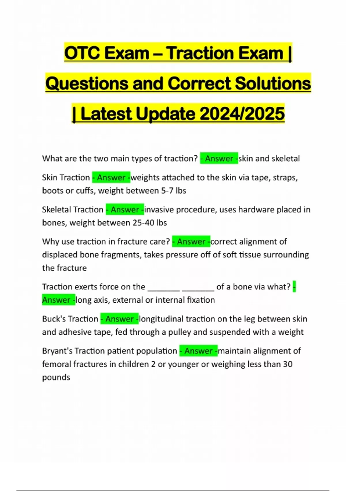 OTC Exam – Traction Exam | Questions and Correct Solutions | Latest Update 2024/2025 What are the two main types of traction? - Answer -skin and skeletal Skin Traction - Answer -weights attached to the skin via tape, straps, boots or cuffs, weight between 5-7 lbs Skeletal Traction - Answer -invasive procedure, uses hardware placed in bones, weight between 25-40 lbs Why use traction in fracture care? - Answer -correct alignment of displaced bone fragments, takes pressure off of soft tissue surrounding the fracture Traction exerts force on the _______ _______ of a bone via what? - Answer -long axis, external or inte