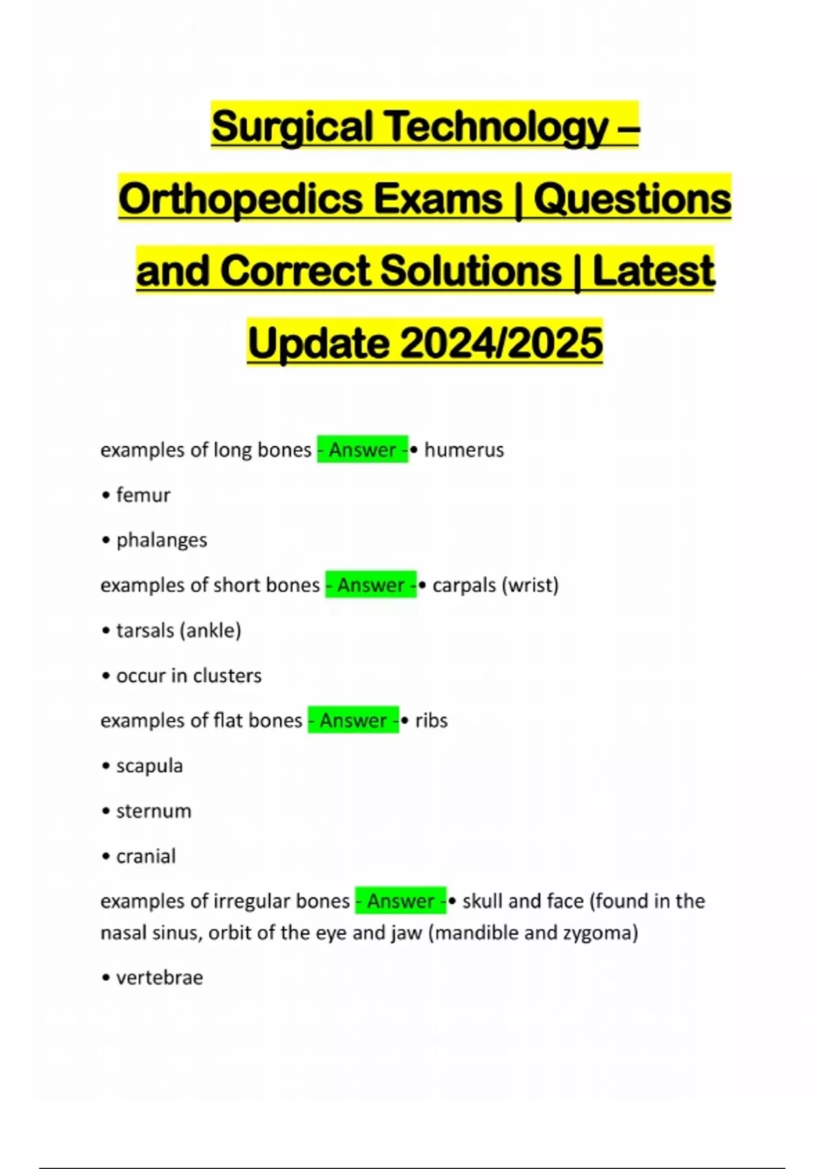 Surgical Technology – Orthopedics Exams | Questions and Correct Solutions | Latest Update 2024/2025 examples of long bones - Answer -• humerus • femur • phalanges examples of short bones - Answer -• carpals (wrist) • tarsals (ankle) • occur in clusters examples of flat bones - Answer -• ribs • scapula • sternum • cranial examples of irregular bones - Answer -• skull and face (found in the nasal sinus, orbit of the eye and jaw (mandible and zygoma) • vertebraeexamples of round bones and what's another name for them? - Answer -• patella • the 2 round bones found on the head of the metatarsal in the foot or "ball" of the foot (Calcaneus) • Round bones or sesamoid what connects the skull? - Answer -• fibrous interlocking joints of connective tissue called sutures, which are unique to cranial bones what are immovable joints called? give an example - Answer -• synarthrosis • "-arthro-" = joint • suture lines of the cranial bones