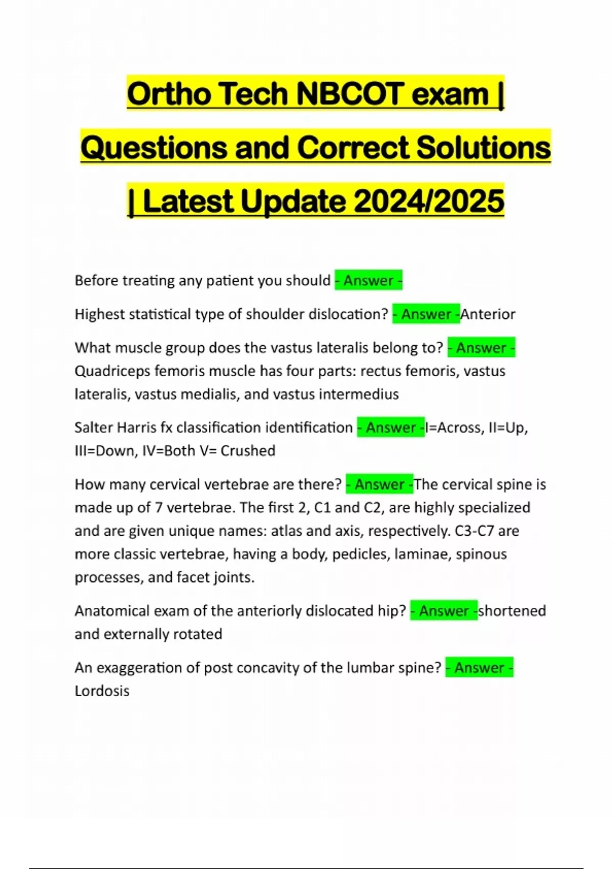 Ortho Tech NBCOT exam | Questions and Correct Solutions | Latest Update 2024/2025 Before treating any patient you should - Answer - Highest statistical type of shoulder dislocation? - Answer -Anterior What muscle group does the vastus lateralis belong to? - Answer - Quadriceps femoris muscle has four parts: rectus femoris, vastus lateralis, vastus medialis, and vastus intermedius Salter Harris fx classification identification - Answer -I=Across, II=Up, III=Down, IV=Both V= Crushed How many cervical vertebrae are there? - Answer -The cervical spine is made up of 7 vertebrae. The first 2, C1 and C2, are highly specialized and are given unique names: atlas and axis, respectively. C3-C7 are more classic vertebrae, having a body, pedicles, laminae, spinous processes, and facet joints. Anatomical exam of the anteriorly dislocated hip? - Answer -shortened and externally rotated An exaggeration of post concavity of the lumbar spine? - Answer - LordosisAn exaggeration of post concavity of the thoracic spine? - Answer - Kyphosis The fx of the base to the fifth metatarsal is a tension or avulsion fx secondary to the pull of what anatomical structure? - Answer -peroneus brevis A fracture of the base of the fifth metatarsal eponyms? - Answer - Jones/dancers Lateral tibial plateau fx is associated with what ligament strain or tear? - Answer -medial collateral ligament The central shaft of the long bone? - Answer -Diaphysis The tight fitting fibrous membrane that cov