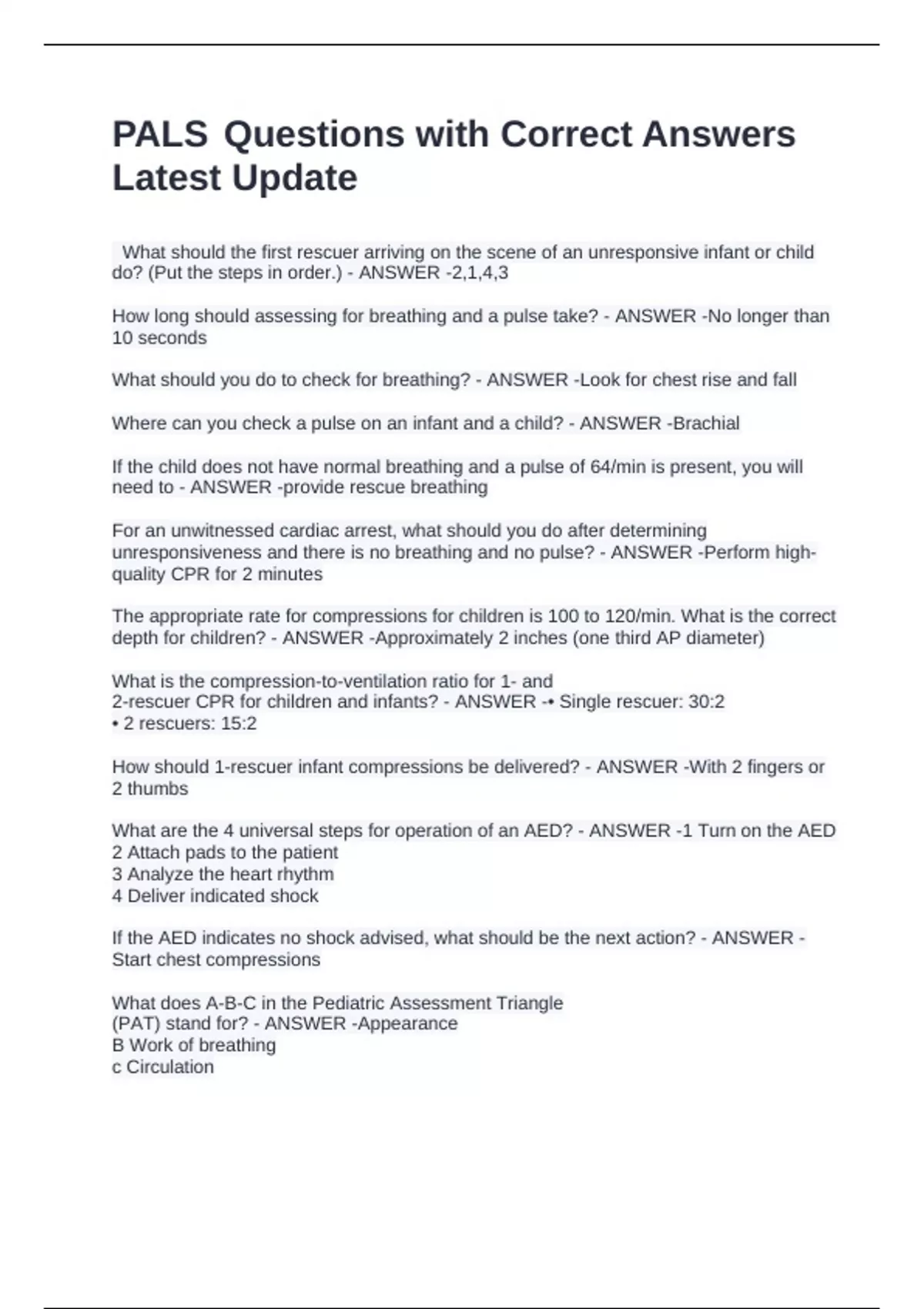 PALS Questions with Correct Answers Latest Update