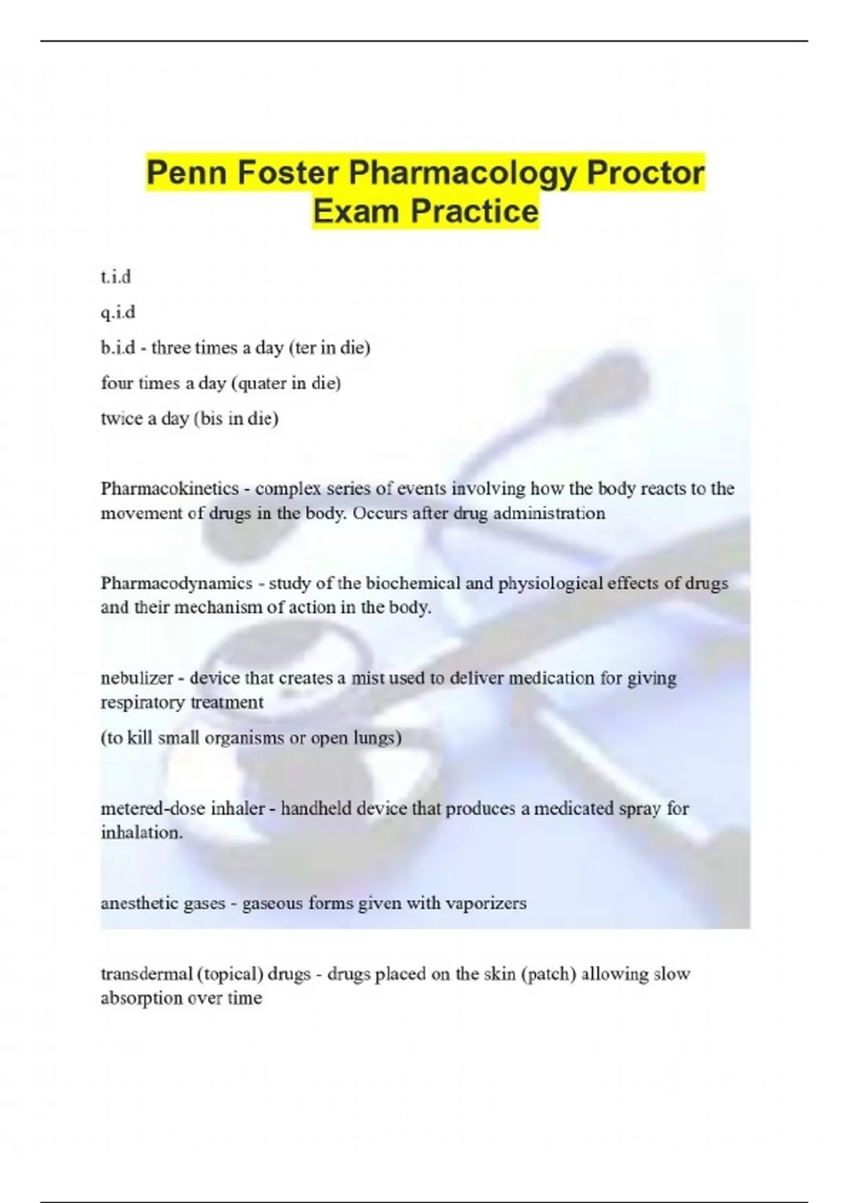 t.i.d q.i.d b.i.d - three times a day (ter in die) four times a day (quater in die) twice a day (bis in die) Pharmacokinetics - complex series of events involving how the body reacts to the movement of drugs in the body. Occurs after drug administration Pharmacodynamics - study of the biochemical and physiological effects of drugs and their mechanism of action in the body. nebulizer - device that creates a mist used to deliver medication for giving respiratory treatment (to kill small organisms or open lungs) metered-dose inhaler - handheld device that produces a medicated spray for inhalation. anesthetic gases - gaseous forms given with vaporizers transdermal (topical) drugs - drugs placed on the skin (patch) allowing slow absorption over time concentration gradient - drugs moving from areas of higher concentration to lower concentration Bioavailability - measures the amount of drug that gets absorbed and is available to patient water-soluble drugs - Drugs that dissolve in water and tend to stay in the bloodstream and either stay free or bond to various proteins (albumin)