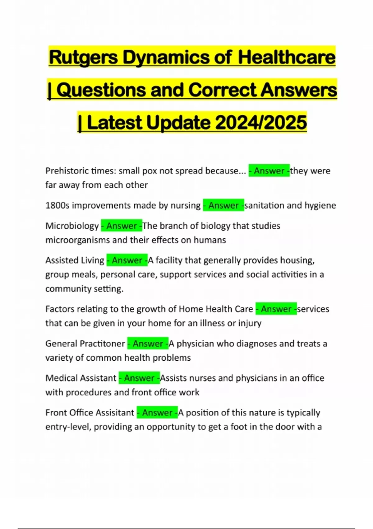 Rutgers Dynamics of Healthcare | Questions and Correct Answers | Latest Update 2024/2025 Prehistoric times: small pox not spread because... - Answer -they were far away from each other 1800s improvements made by nursing - Answer -sanitation and hygiene Microbiology - Answer -The branch of biology that studies microorganisms and their effects on humans Assisted Living - Answer -A facility that generally provides housing, group meals, personal care, support services and social activities in a community setting. Factors relating to the growth of Home Health Care - Answer -services that can be given in your home for an illness or injury General Practitoner - Answer -A physician who diagnoses and treats a variety of common health problems Medical Assistant - Answer -Assists nurses and physicians in an office with procedures and front office work Front Office Assisitant - Answer -A position of this nature is typically entry-level, providing an opportunity to get a foot in the door with asales office, doctor's office, accounting firm, hotel or other type of company Greek and Roman: ancient cultures medical care - Answer -first hospitals and doctors Chiropractic - Answer -A person who practices chiropractic, specializing in the diagnosis, treatment and preventi