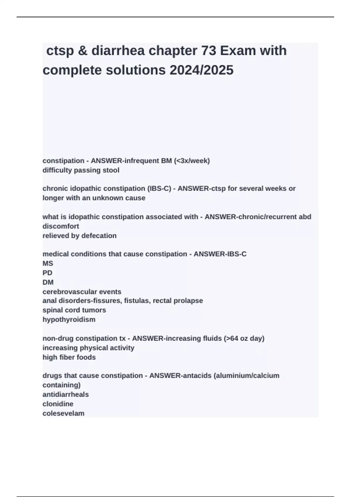non-drug constipation tx - ANSWER-increasing fluids (>64 oz day)