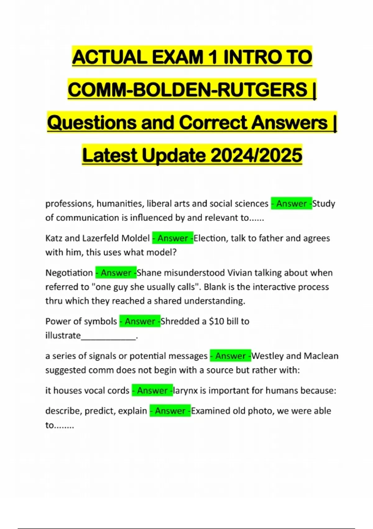 ACTUAL EXAM 1 INTRO TO COMM-BOLDEN-RUTGERS | Questions and Correct Answers | Latest Update 2024/2025 professions, humanities, liberal arts and social sciences - Answer -Study of communication is influenced by and relevant to...... Katz and Lazerfeld Moldel - Answer -Election, talk to father and agrees with him, this uses what model? Negotiation - Answer -Shane misunderstood Vivian talking about when referred to "one guy she usually calls". Blank is the interactive process thru which they reached a shared understanding. Power of symbols - Answer -Shredded a $10 bill to illustrate___________. a series of signals or potential messages - Answer -Westley and Maclean suggested comm does not begin with a source but rather with: it houses vocal cords - Answer -larynx is important for humans because: describe, predict, explain - Answer -Examined old photo, we were able to........Logical - Answer -Which is false about relationship between