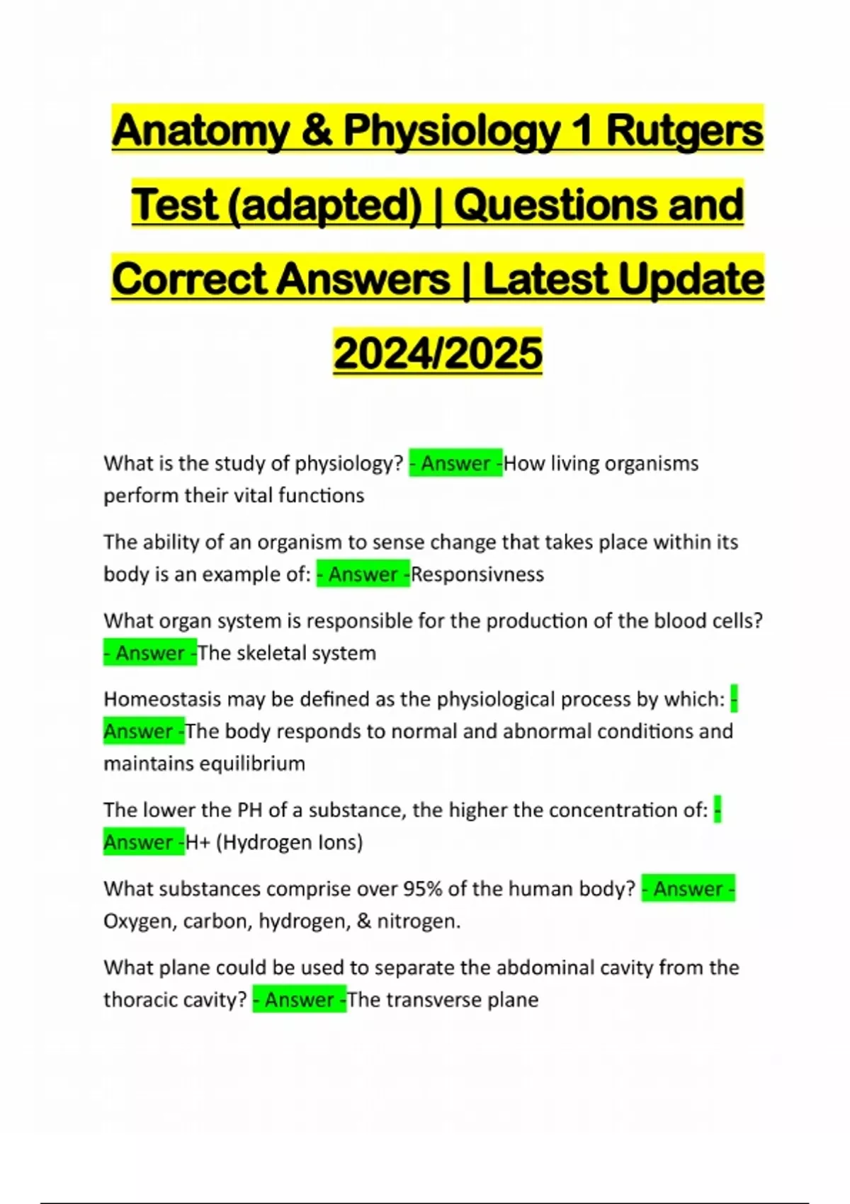 Anatomy & Physiology 1 Rutgers Test (adapted) | Questions and Correct Answers | Latest Update 2024/2025 What is the study of physiology? - Answer -How living organisms perform their vital functions The ability of an organism to sense change that takes place within its body is an example of: - Answer -Responsivness What organ system is responsible for the production of the blood cells? - Answer -The skeletal system Homeostasis may be defined as the physiological process by which: - Answer -The body responds to normal and abnormal conditions and maintains equilibrium The lower the PH of a substance, the higher the concentration of: - Answer -H+ (Hydrogen Ions) What substances comprise over 95% of the human body? - Answer - Oxygen, carbon, hydrogen, & nitrogen. What plane could be used to separate the abdominal cavity from the thoracic cavity? - Answer -The transverse planeThe anatomical position is described as follows: - Answer -The human body is standing upright, feet together, and palms facing anteriorly. A_________section divides the body