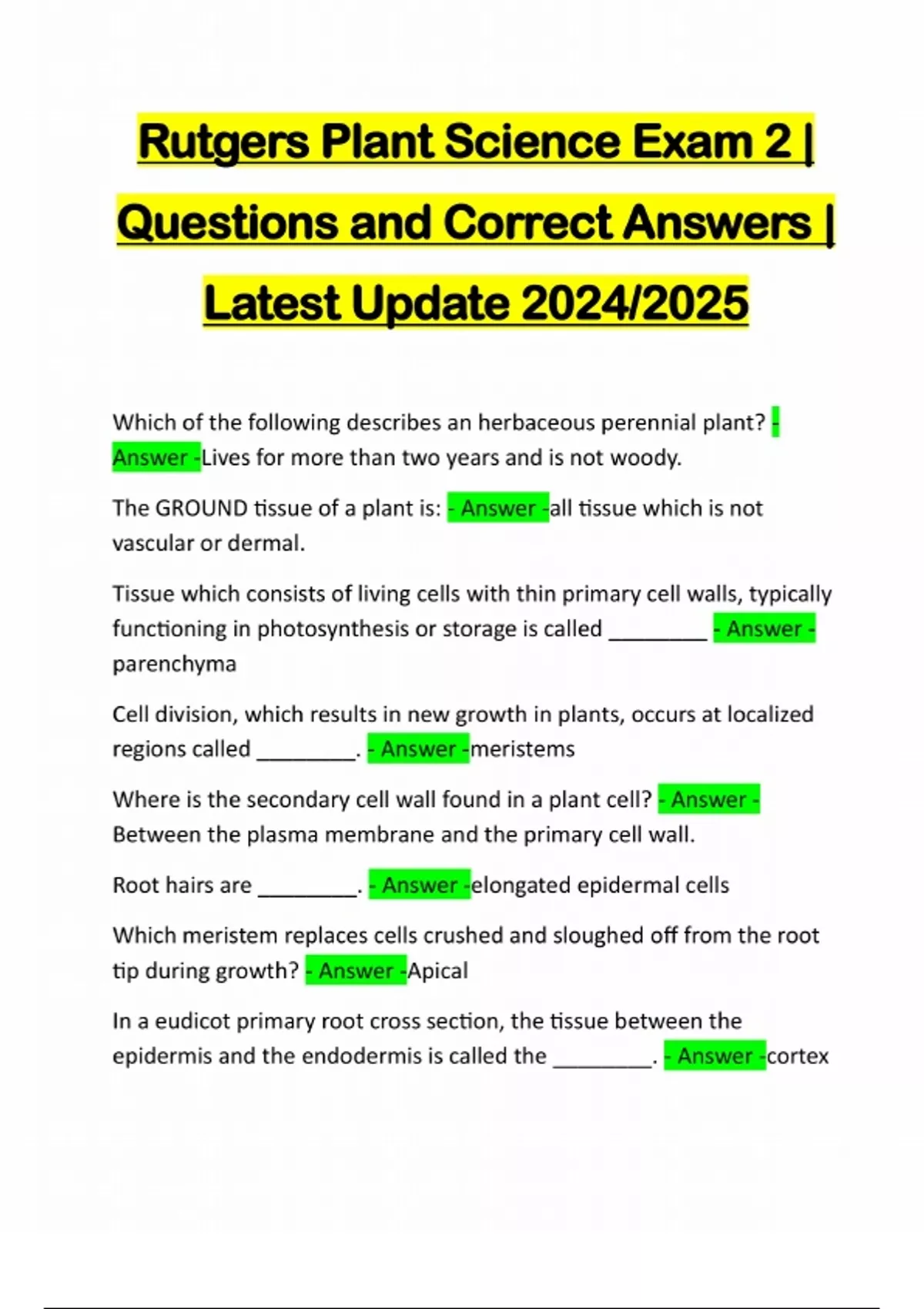 Rutgers Plant Science Exam 2 | Questions and Correct Answers | Latest Update 2024/2025 Which of the following describes an herbaceous perennial plant? - Answer -Lives for more than two years and is not woody. The GROUND tissue of a plant is: - Answer -all tissue which is not vascular or dermal. Tissue which consists of living cells with thin primary cell walls, typically functioning in photosynthesis or storage is called ________ - Answer - parenchyma Cell division, which results in new growth in plants, occurs at localized regions called ________. - Answer -meristems Where is the secondary cell wall found in a plant cell? - Answer - Between the plasma membrane and the primary cell wall. Root hairs are ________. - Answer -elongated epidermal cells Which meristem replaces cells crushed and sloughed off from the root tip during growth? - Answer -Apical In a eudicot primary root cross section, the tissue between the epidermis and the endodermis is called the ________. - Answer -cortexThe water-proof band of suberin found around the cell walls of t