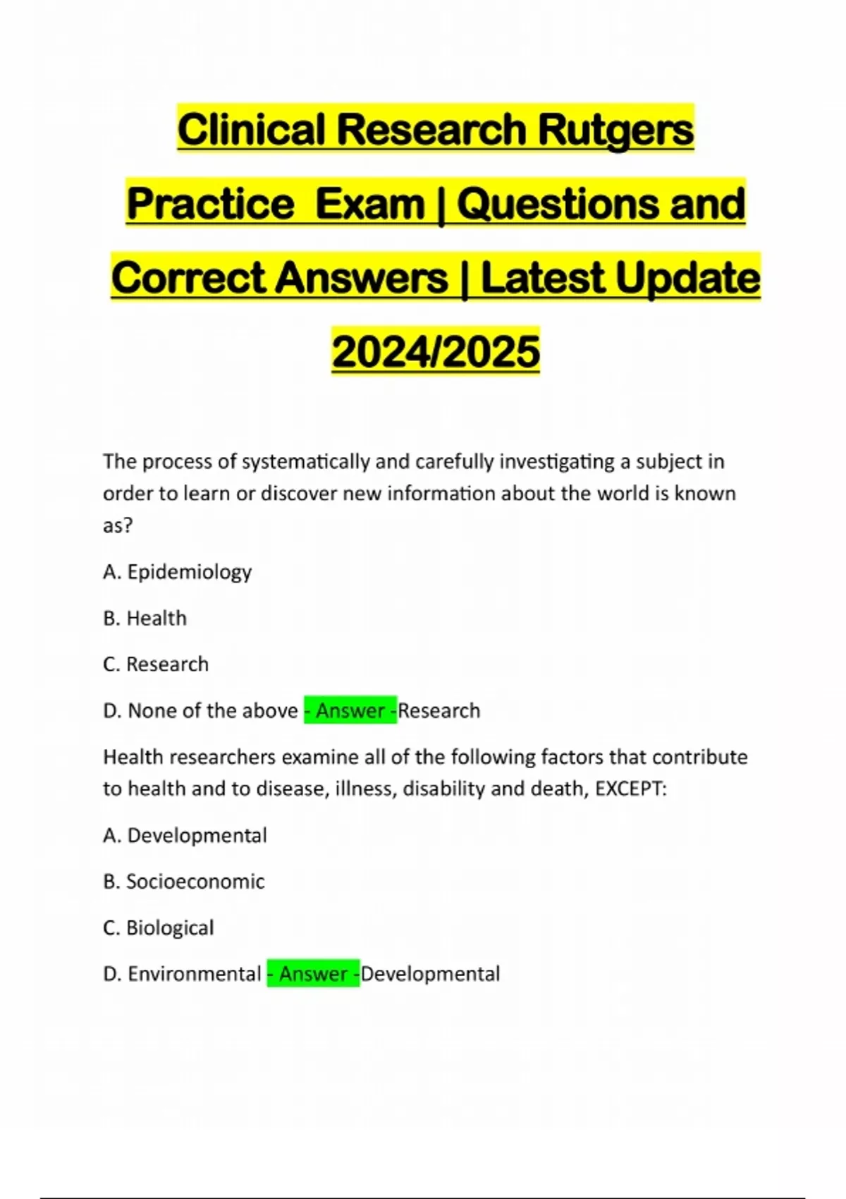 Clinical Research Rutgers Practice Exam | Questions and Correct Answers | Latest Update 2024/2025 The process of systematically and carefully investigating a subject in order to learn or discover new information about the world is known as? A. Epidemiology B. Health C. Research D. None of the above - Answer -Research Health researchers examine all of the following factors that contribute to health and to disease, illness, disability and death, EXCEPT: A. Developmental B. Socioeconomic C. Biological D. Environmental - Answer -DevelopmentalPopulation-based studies are typically conducted using: A. Human subjects B. Animals C. Research facilities D. None of the above - Answer -Human Subjects Which is NOT an example of Laboratory research? A. Compare tests of air quality in several metropolitan areas B. Identify biological mechanism