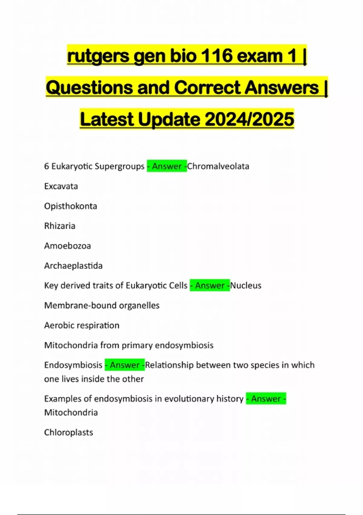 rutgers gen bio 116 exam 1 | Questions and Correct Answers | Latest Update 2024/2025 6 Eukaryotic Supergroups - Answer -Chromalveolata Excavata Opisthokonta Rhizaria Amoebozoa Archaeplastida Key derived traits of Eukaryotic Cells - Answer -Nucleus Membrane-bound organelles Aerobic respiration Mitochondria from primary endosymbiosis Endosymbiosis - Answer -Relationship between two species in which one lives inside the other Examples of endosymbiosis in evolutionary history - Answer - Mitochondria Chloroplastsserial endosymbiosis - Answer -series of endosymbiotic events primary endosymbiosis - Answer -the process in which a eukaryote engulfs another living prokaryote Primary endosymbiosis example - Answer -Archaea engulfing alpha proteobacteria (mitochondria, first) Heterotrophic Euk engulfing cyanobacteria (chloroplasts, second) secondary endosymbiosis - Answer -Bigger eukaryote engulfs smaller eukaryote, leads to secondary plasti