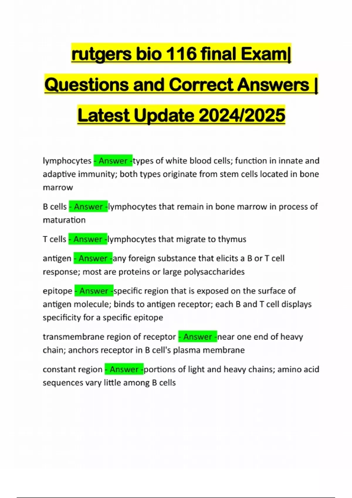 rutgers bio 116 final Exam| Questions and Correct Answers | Latest Update 2024/2025 lymphocytes - Answer -types of white blood cells; function in innate and adaptive immunity; both types originate from stem cells located in bone marrow B cells - Answer -lymphocytes that remain in bone marrow in process of maturation T cells - Answer -lymphocytes that migrate to thymus antigen - Answer -any foreign substance that elicits a B or T cell response; most are proteins or large polysaccharides epitope - Answer -specific region that is exposed on the surface of antigen molecule; binds to antigen receptor; each B and T cell displays specificity for a specific epitope transmembrane region of receptor - Answer -near one end of heavy chain; anchors receptor in B cell's plasma membrane constant region - Answer -portions of light and heavy chains; amino acid sequences vary little among B cellsvariable region - Answer -found within tips of Y shape; each tip is binding site for antigen; each receptor has 2 identical antigen binding sites B cell classes - Answer -IgA, IgD, IgE, IgG, and IgM