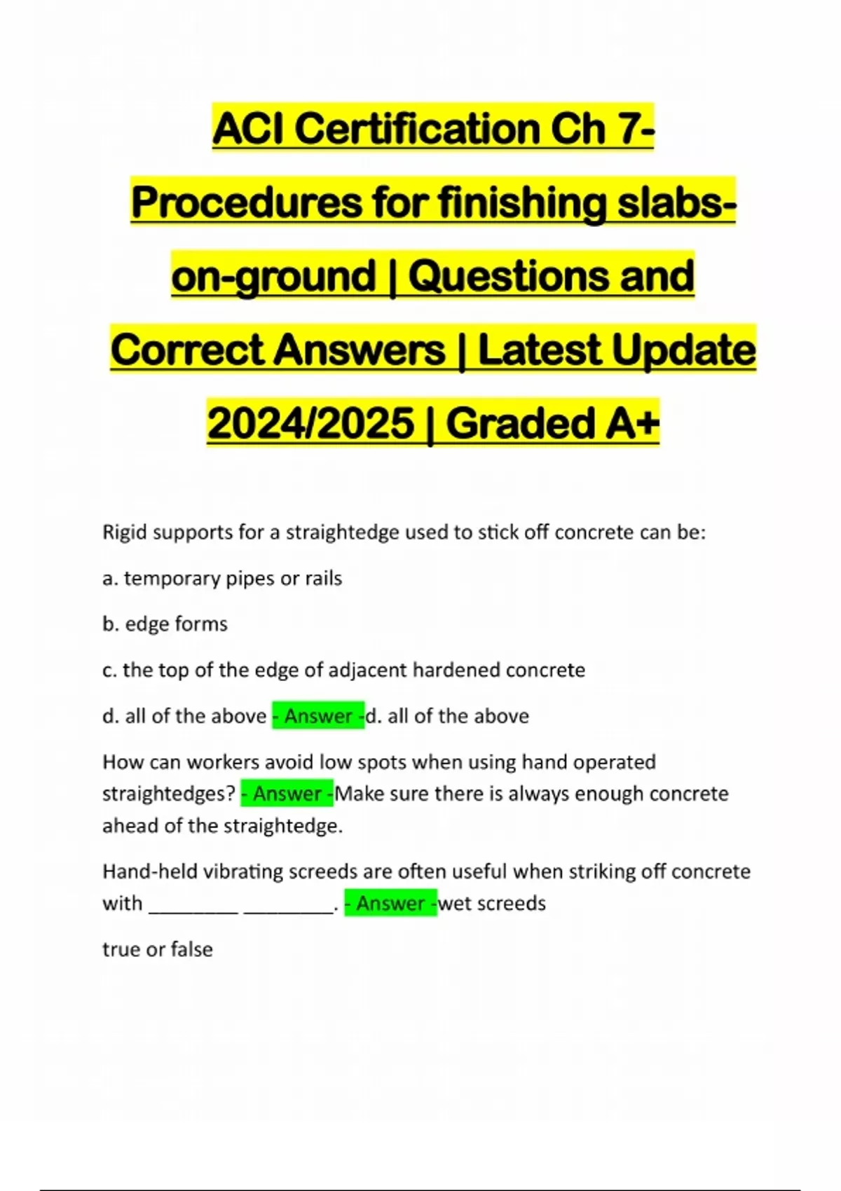 ACI Certification Ch 7- Procedures for finishing slabson-ground | Questions and Correct Answers | Latest Update 2024/2025 | Graded A+ Rigid supports for a straightedge used to stick off concrete can be: a. temporary pipes or rails b. edge forms c. the top of the edge of adjacent hardened concrete d. all of the above - Answer -d. all of the above How can workers avoid low spots when using hand operated straightedges? - Answer -Make sure there is always enough concrete ahead of the straightedge. Hand-held vibrating screeds are often useful when striking off concrete with ________ ________. - Answer -wet screeds true or falsevibrating screeds should be moved forward as fast as proper consolidation allows to avoid bringing too much mortar to the surface. - Answer -true On slabs with many protruding pipes, a ________ works better than a ________ ________ for smoothing th