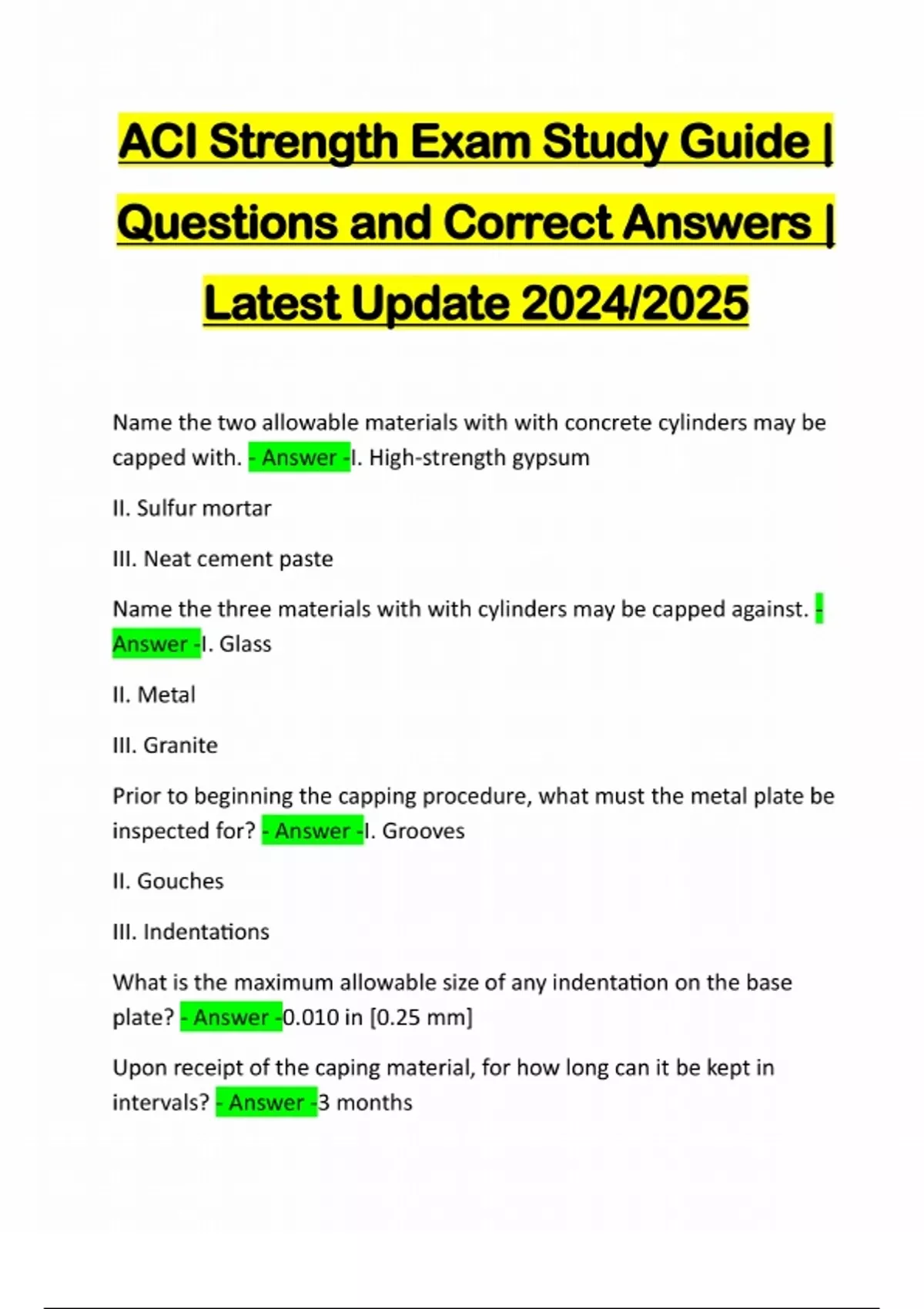 ACI Strength Exam Study Guide | Questions and Correct Answers | Latest Update 2024/2025 Name the two allowable materials with with concrete cylinders may be capped with. - Answer -I. High-strength gypsum II. Sulfur mortar III. Neat cement paste Name the three materials with with cylinders may be capped against. - Answer -I. Glass II. Metal III. Granite Prior to beginning the capping procedure, what must the metal plate be inspected for? - Answer -I. Grooves II. Gouches III. Indentations What is the maximum allowable size of any indentation on the base plate? - Answer -0.010 in [0.25 mm] Upon receipt of the caping material, for how long can it be kept in intervals? - Answer -3 monthsWhen must the neat cement paste be applied it to the cylinder? - Answer -Immediately For how long must the concrete settle in the mold prior to applying the neat cement paste? - Answer -2 to 4 hours Prior to capping, name the three tasks tha