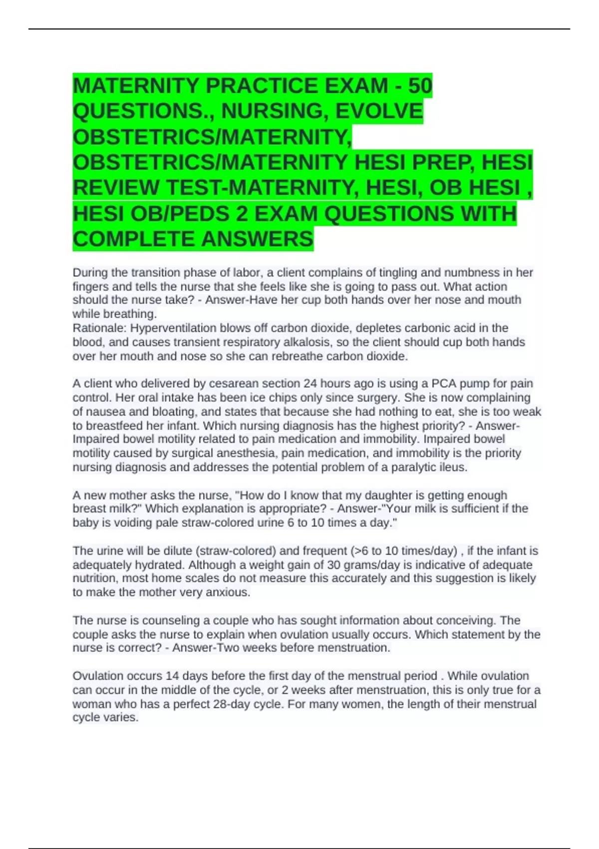 REVIEW TEST-MATERNITY, HESI, OB HESI ,