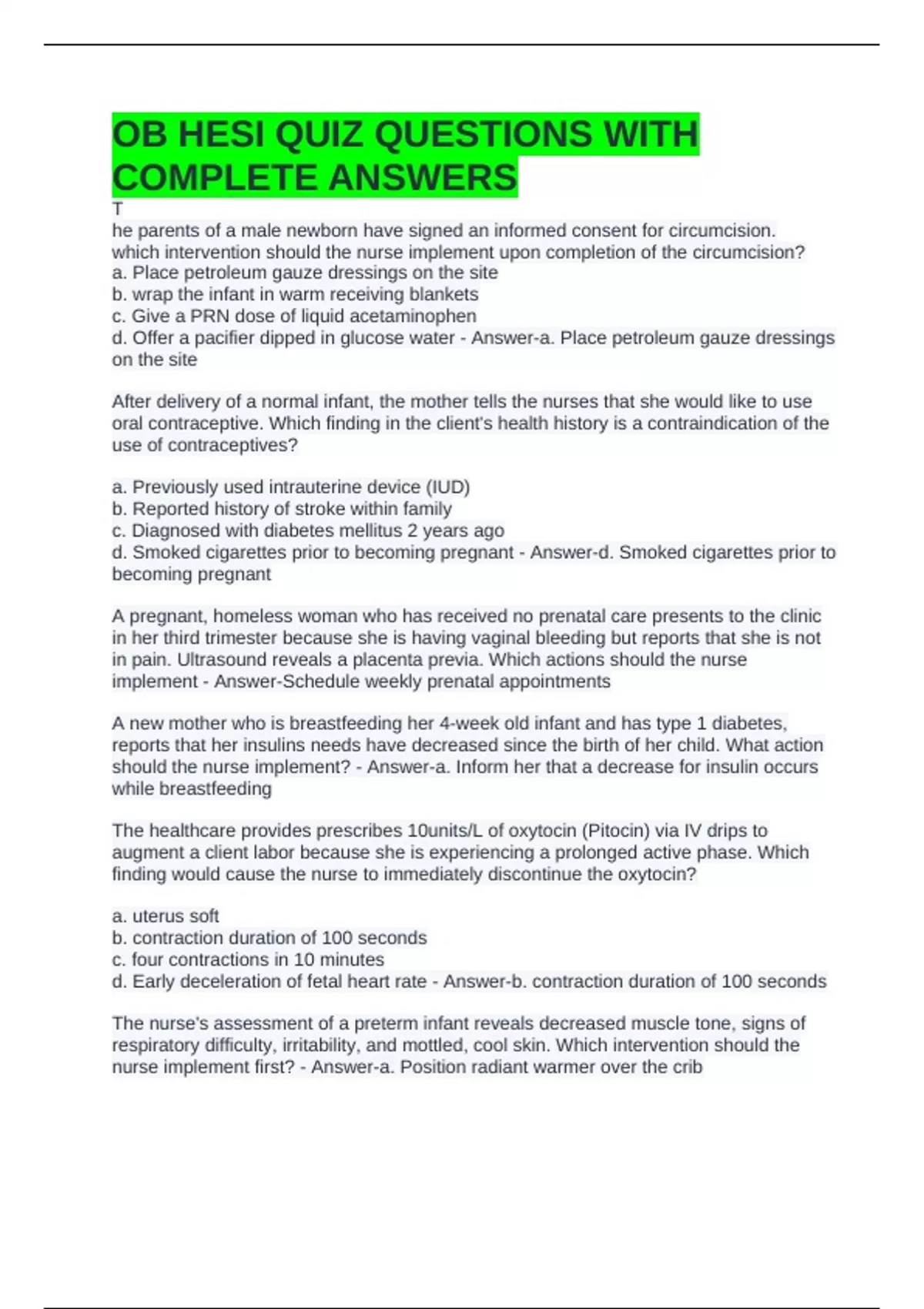 OB HESI QUIZ QUESTIONS WITH