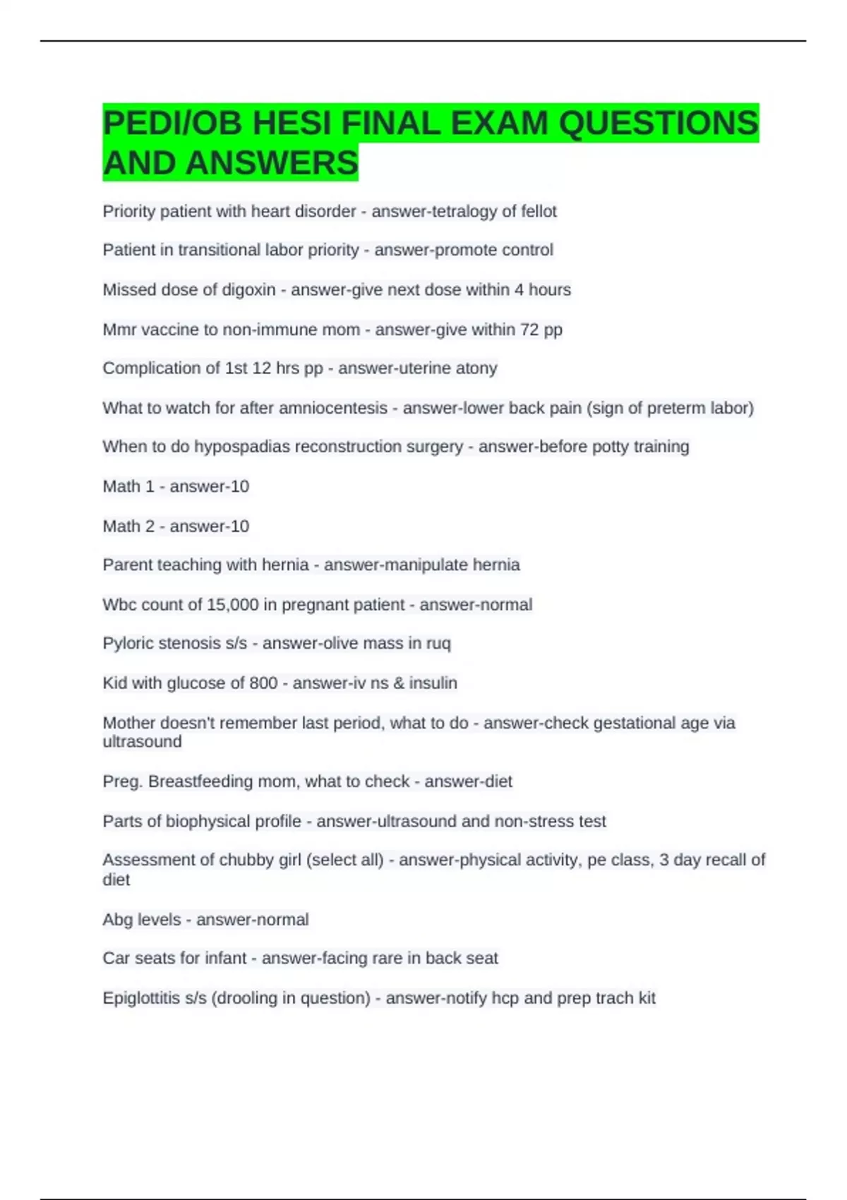 PEDI/OB HESI FINAL EXAM QUESTIONS