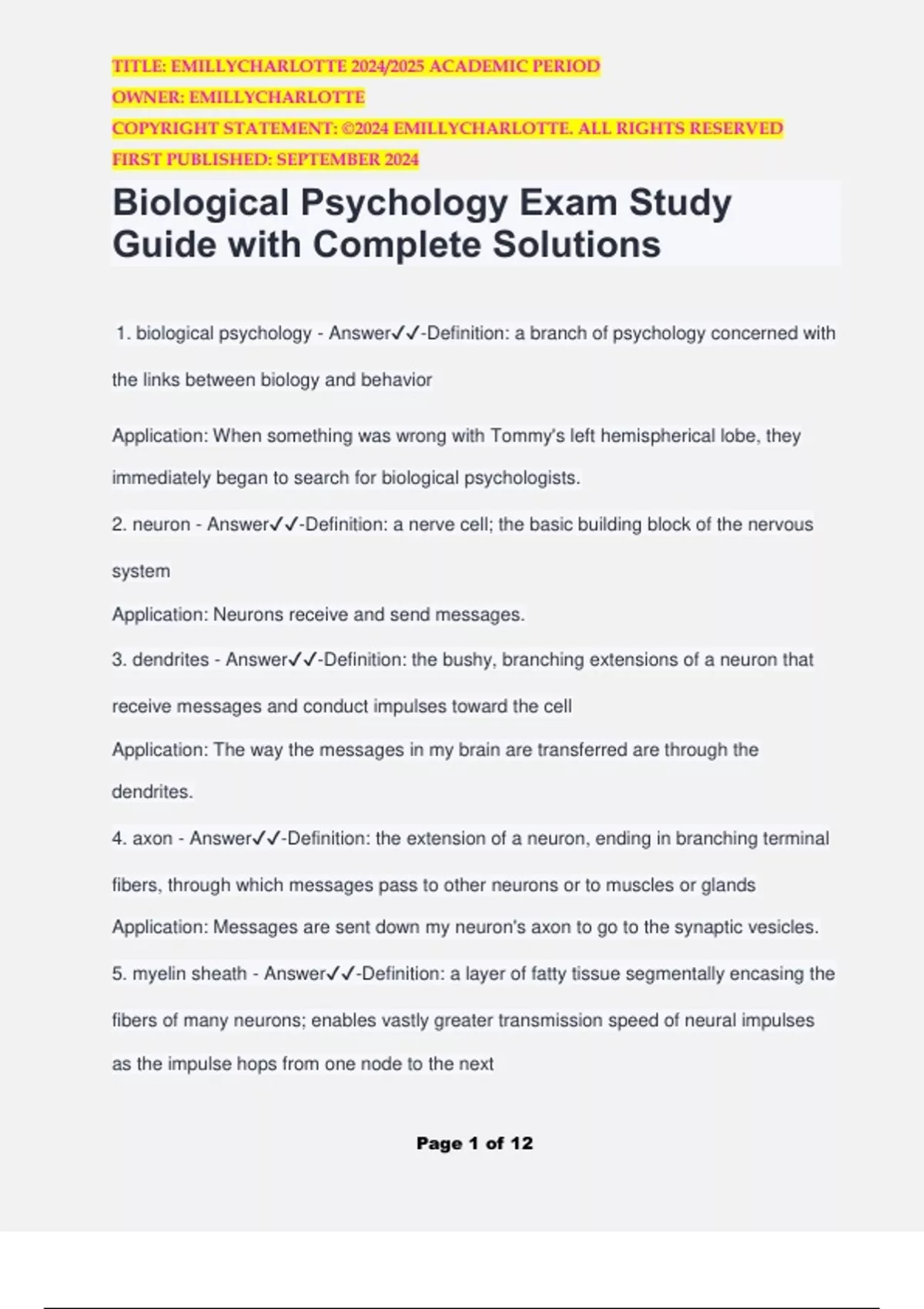 1. biological psychology - Answer✔️✔️-Definition: a branch of psychology concerned with