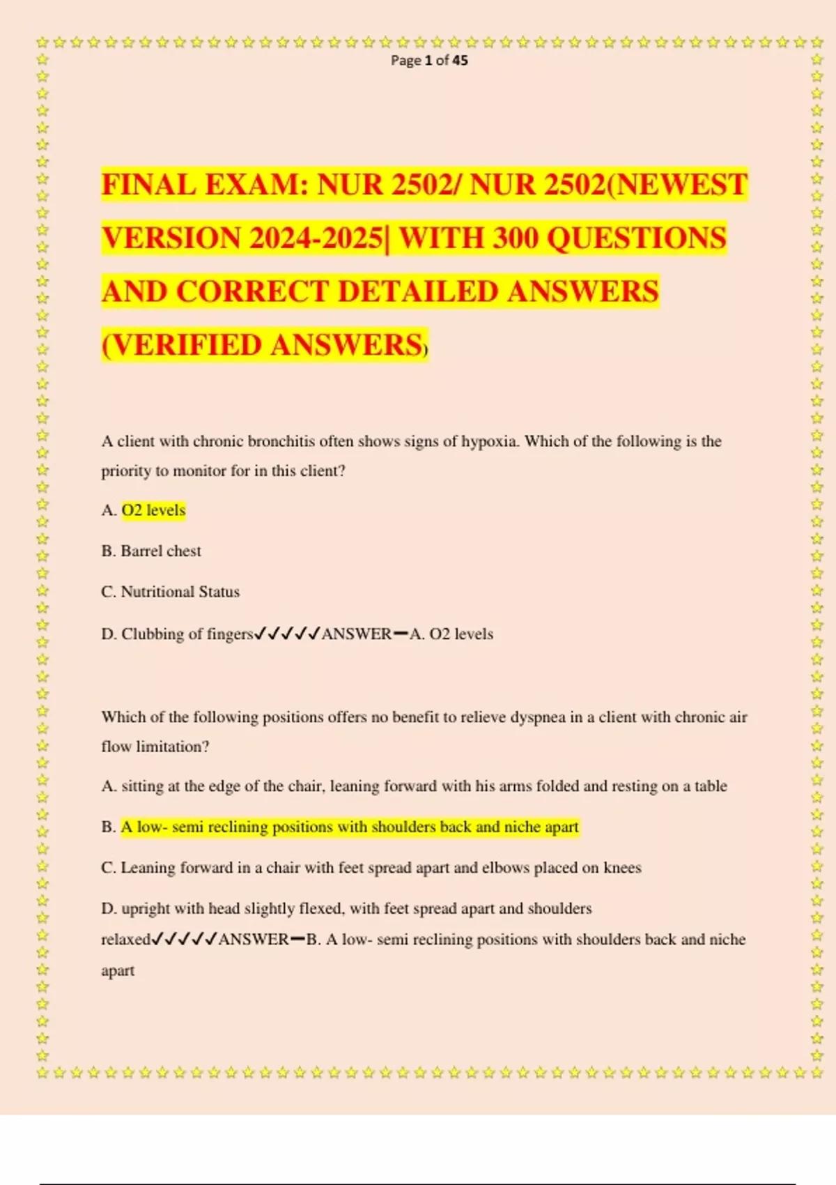 FINAL EXAM: NUR 2502/ NUR 2502(NEWEST VERSION | WITH 300 QUESTIONS AND CORRECT DETAILED ANSWERS (VERIFIED ANSWERS)