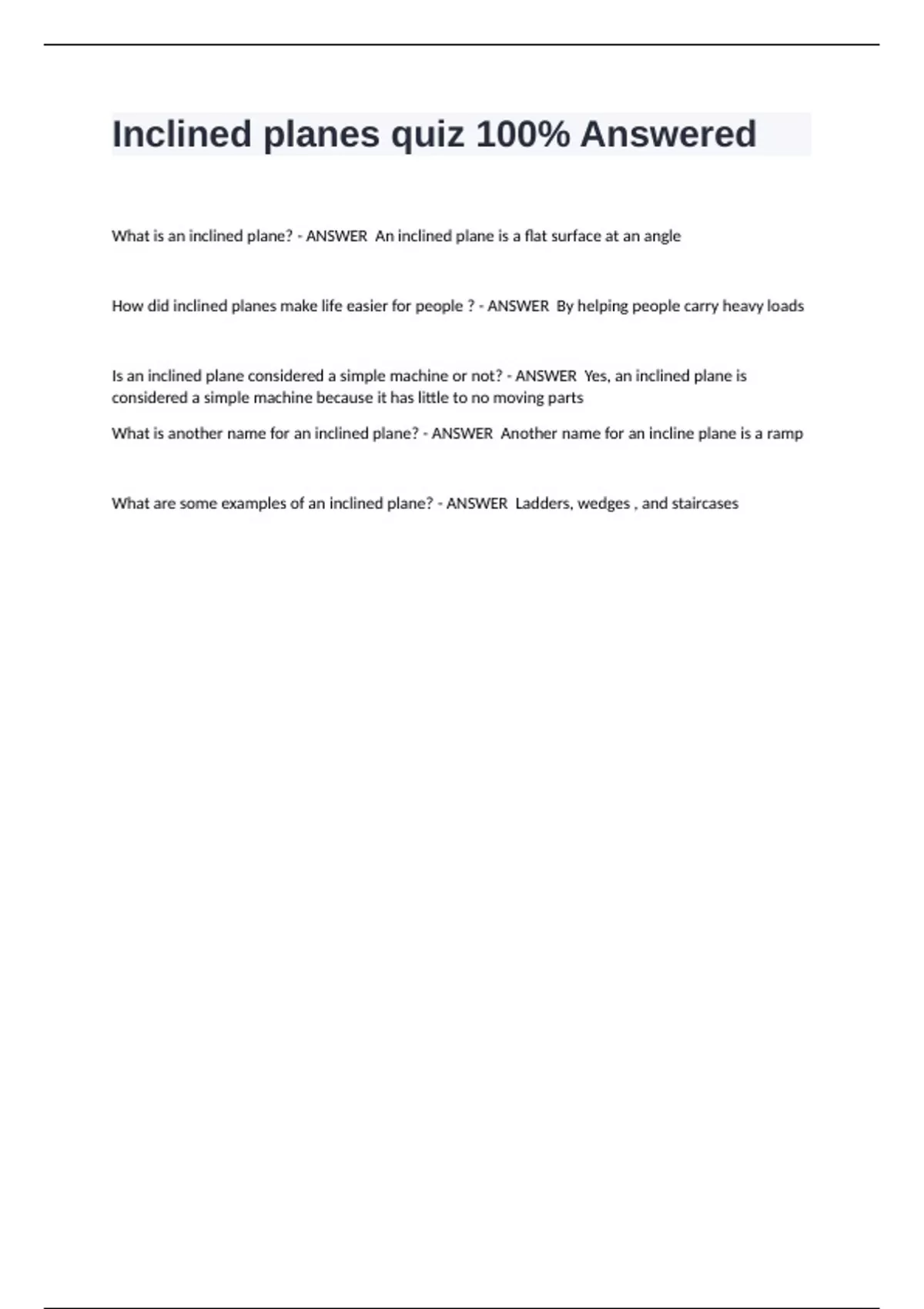 What are some examples of an inclined plane? - ANSWER Ladders, wedges , and staircases