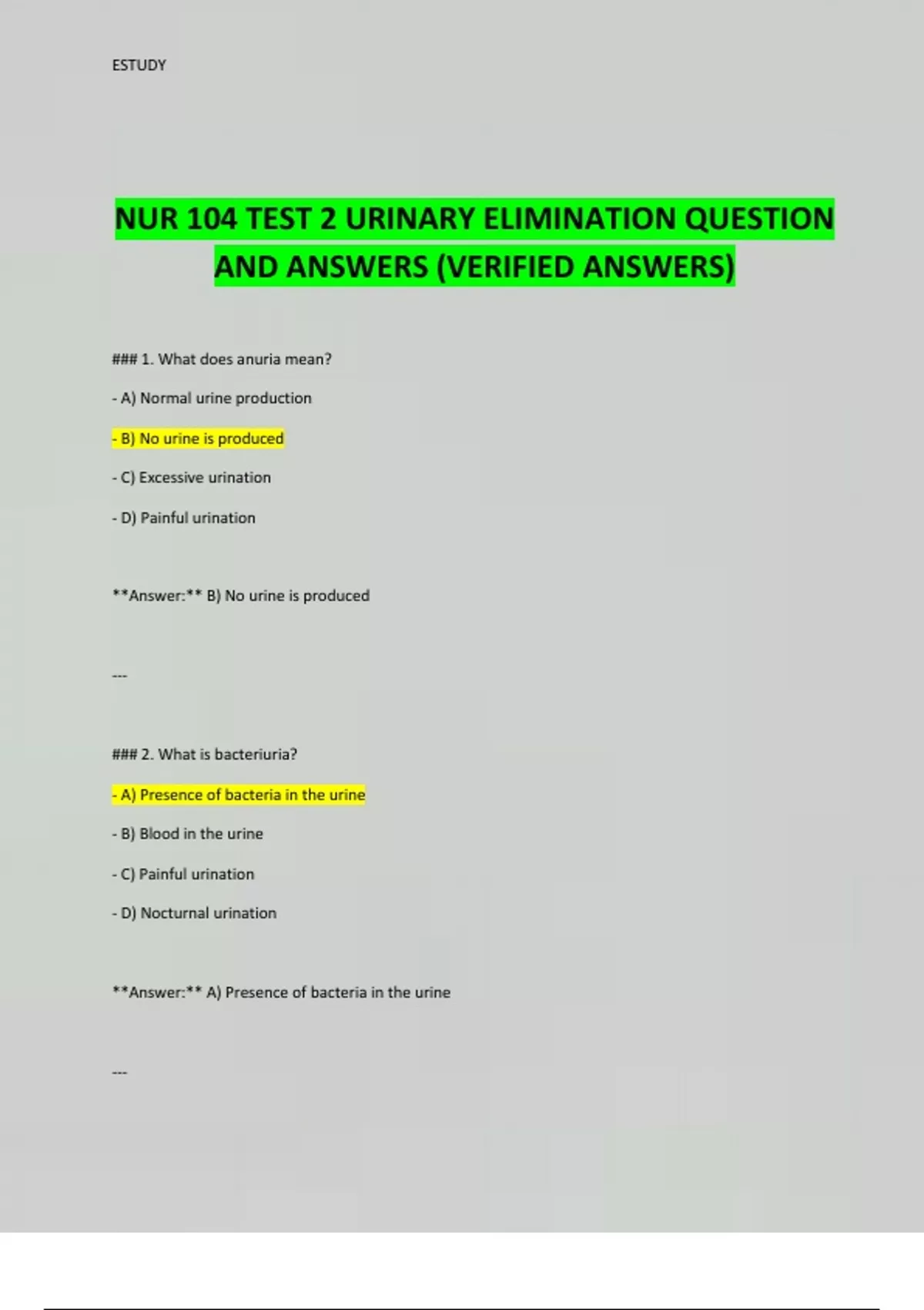 NUR 104 TEST 2 URINARY ELIMINATION QUESTION AND ANSWERS (VERIFIED ANSWERS)