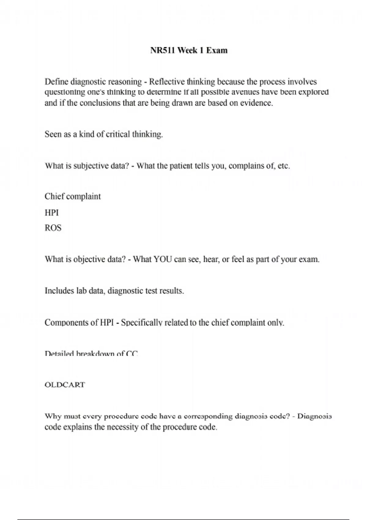 Define diagnostic reasoning - Reflective thinking because the process involves questioning one's thinking to determine if all possible avenues have been explored and if the conclusions that are being drawn are based on evidence. Seen as a kind of critical thinking. What is subjective data? - What the patient tells you, complains of, etc. Chief complaint HPI ROS What is objective data? - What YOU can see, hear, or feel as part of your exam. Includes lab data, diagnostic test results. Components of HPI - Specifically related to the chief complaint only. Detailed breakdown of CC. OLDCART Why must every procedure code have a corresponding diagnosis code? - Diagnosis code explains the necessity of the procedure code. Insurance won't pay if they don't correspond. What are the three components required in determining an outpatient office visit E&M code? - Place of service Type of service Patient status What is medical coding? - The use of codes to communicate with payers about which procedures were performed and why What is medical billing? - Process of submitting and following up on claims made to a payer in order to receive payment for medical services rendered by a healthcare provider. What are CPT codes? - Common procedural terminology Offers the official procedural coding rules and guidelines required when reporting medical services and procedures performed by physician and non-physician providers. What are ICD codes? - International classification of disease Used to provide payer info on necessity of visit or procedure performed. What is specificity? - The ability of the test to correctly detect a specific condition. If a patient has a condition but test is negative, it is a false negative. If a patient does NOT have a condition but the test is positive, it is a false positive. What is sensitivity? - Test that has few false negatives. Ability of a test to correctly identify a specific condition when it is present. The higher the sensitivity, the lesser the likelihood of a false negative. What is predictive value? - The likelihood that the patient actually has the condition and is, in part, dependent upon the prevalence of the condition in the population. If a condition is highly likely, the positive result would be more accurate. answer is true What elements need to be considered when developing a plan? - Pt's preferences and actions Research evidence Clinical state/circumstances Clinical expertise What are the components of medical decision making in E&M coding? - Risk Data Diagnosis The more time and consideration involved in dealing with a pt, the higher the reimbursement from the payer. Documentation must reflect MDM! Correctly order the E&M office visit codes based on complexity from least to most complex. - New patient: 1. Minimal/RN visit: 99201 2. Problem focused: 99202 3. Expanded problem focused: 99203 4. Detailed: 99204 5. Comprehensive: 99205 Established patient: 1. Minimal/RN visit: 99211 2. Problem focused: 99212 3. Expanded problem focused: 99213 4. Detailed: 99214 5. Comprehensive: 99215 Define the components of a SOAP note - S: subjective (what the pt tells you) CC HPI PMH Fam Hx Social Hx ROS O: objective (what you can see, hear, feel on exam) Physical findings VS General survey HEENT Etc... A: assessment Global assessment of pt including differentials in order from most to least likely. Combination of subjective and objective info. List of dx addressed and billed for at the visit P: plan What you will Rx When to come back Diagnostic tests Pt education What are purposes of the written H&P in relation to the importance of documentation? - Important reference document that gives concise info about the pt's Hx and exam findings. Outlines a plan for addressing issues that prompted the visit. Info should be presented in a logical fashion that prominently features all data relevant to the pt's condition. Is a means of communicating info to all providers involved in the pt's care. Is a medical-legal document. Is essential in order to accurately code and bill for services. When is a pt considered a "new" pt? - If that pt has never been seen in that clinic or by that group of providers OR if the pt has not been seen in the past 3 years. What does a well-rounded clinical experience mean? - Includes seeing kids from birth through young adult visits for well child and acute visits, as well as adults for wellness or acute/routine visits. Seeing a variety of pt's, including 15% of peds and 15% of women's health of total time in the program. What are the maximum number of hours that time can be spent "rounding" in a facility during clinicals? - No more than 25% of total practicum hours in the program What are 9 things that must be documented in the clinical encounter logs? - Date of service Age Gender and ethnicity Visit E&M code CC Procedures Tests performed and ordered Dx Level of involvement (mostly student, mostly preceptor, together, etc.) What is the first "S" in the SNAPPS presentation? - Summarize: present the pt's H&P findings What is the "N" in the SNAPPS presentation? - Narrow: based on the H&P findings, narrow down to the top 2-3 differentials What is the "A" in the SNAPPS presentation? - Analyze: analyze the differentials. Compare and contrast H&P findings for each of the differentials and narrow it down to the most likely one What is the first "P" in the SNAPPS presentation? - Probe: ask the preceptor questions of anything you are unsure of. What is the second "P" in the SNAPPS presentation? - Plan: come up with a specific management plan. What is the last "S" in the SNAPPS presentation? - Self-directed learning: an opportunity to investigate more about any topics that you are uncertain of. Drew Brees is scheduled for an acute visit for a skin lesion. After looking at his lesion he pulls out a long list of things he wants to discuss. You are 30 minutes behind on your schedule and you only have 15 minutes for this appointment. Which of the following is the best response to