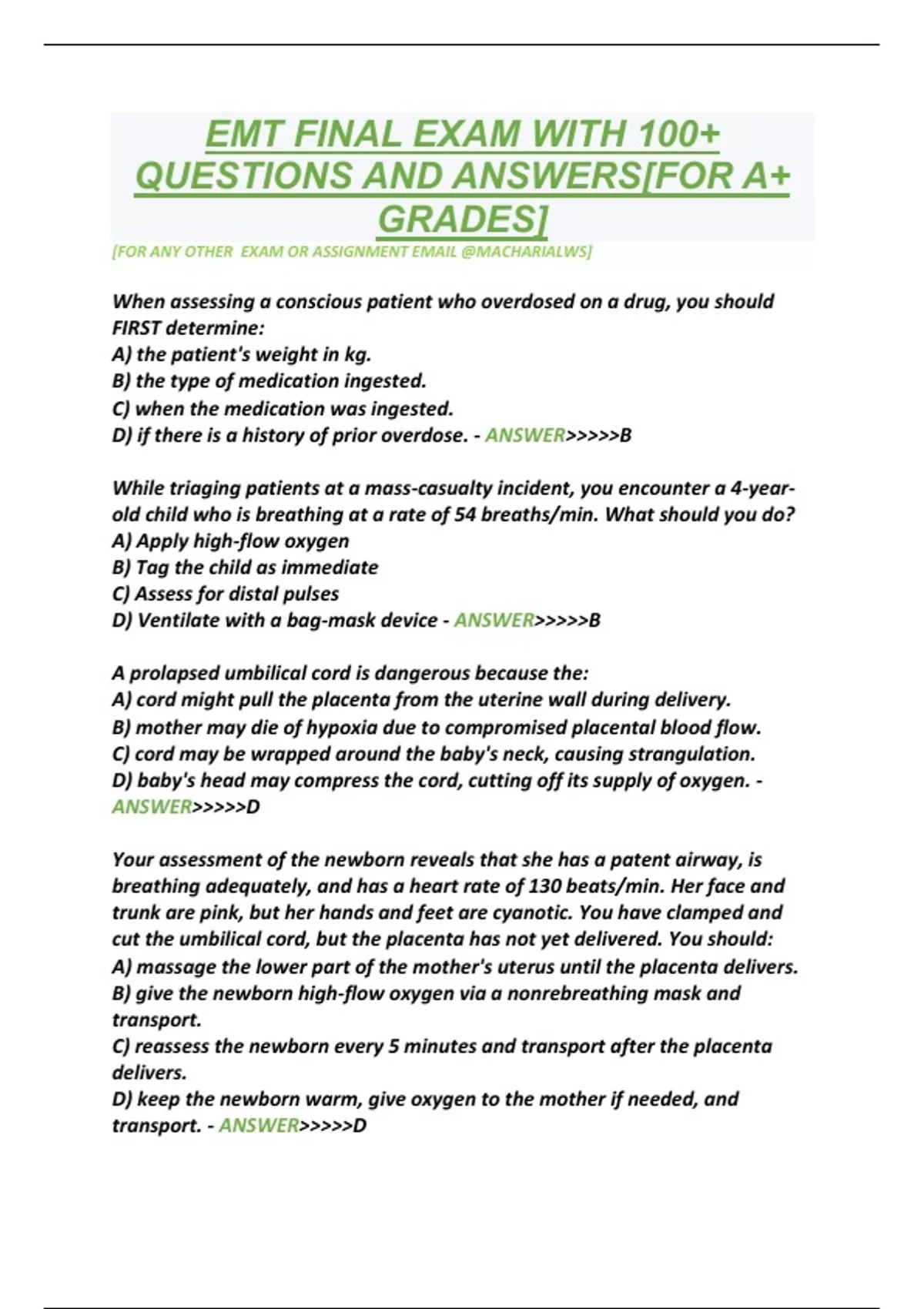 EMT FINAL EXAM WITH 100+ QUESTIONS AND ANSWERS[FOR A+ GRADES]