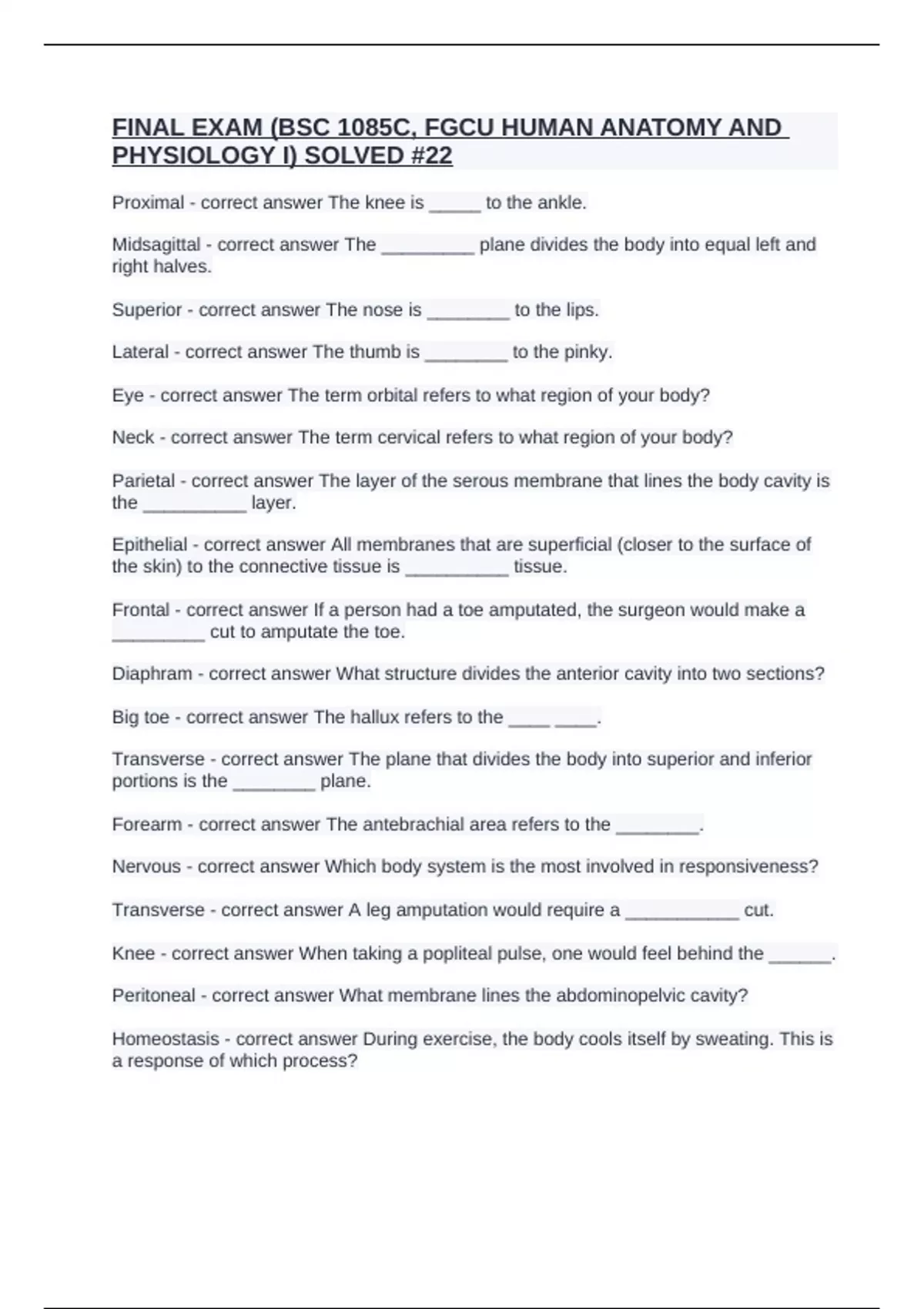 Transverse - correct answer The plane that divides the body into superior and inferior