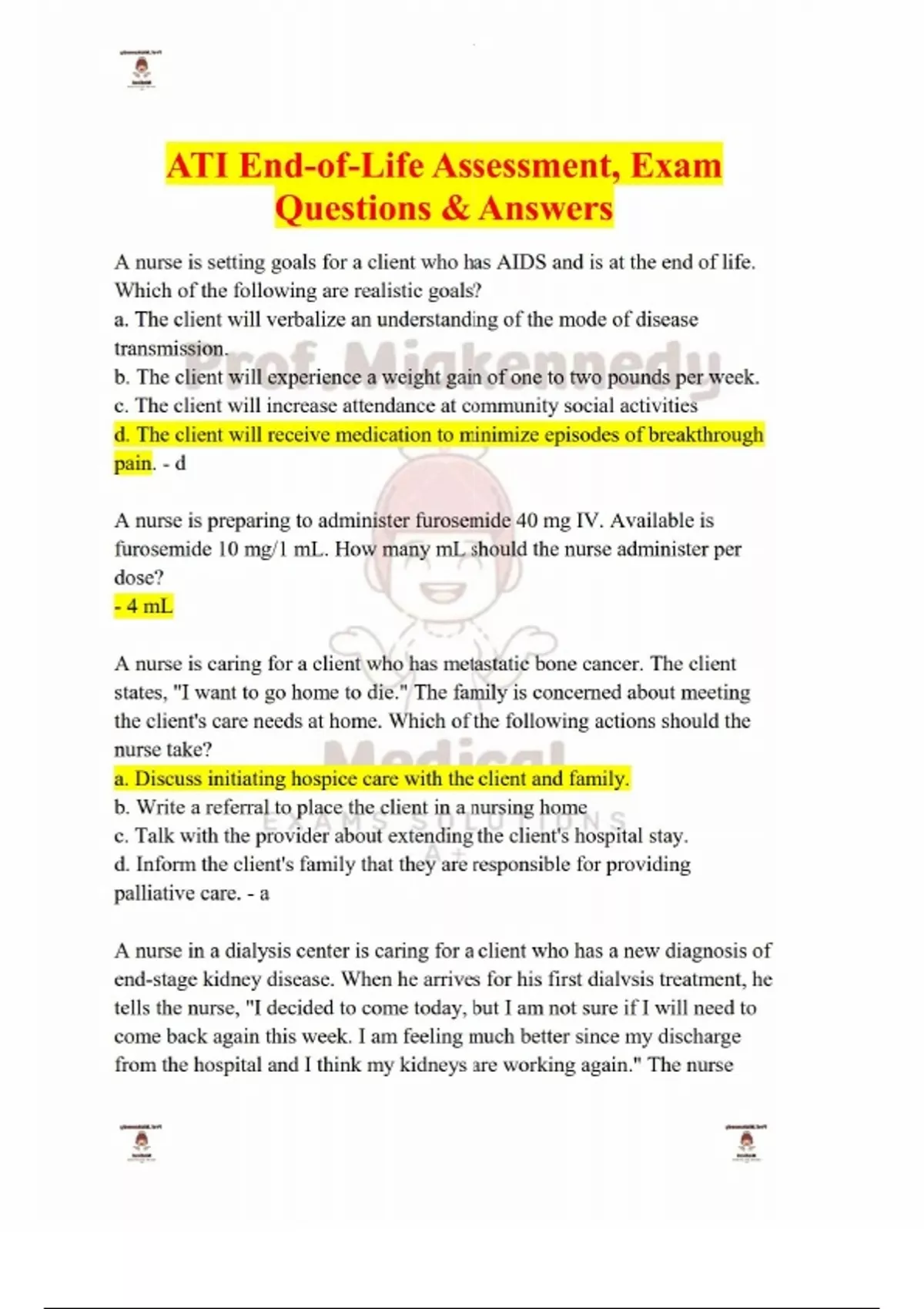 ATI End-of-Life Assessment, Exam Questions & Answers-A nurse is setting goals for a client who has AIDS and is at the end of life. Which of the following are realistic goals? a. The client will verbalize an understanding of the mode of disease transmission. b. The client will experience a weight gain of one to two pounds per week. c. The client will increase attendance at community social activities d. The client will receive medication to minimize episodes of breakthrough pain. - d A nurse is preparing to administer furosemide 40 mg IV. Available is furosemide 10 mg/1 mL. How many mL should the nurse administer per dose? - 4 mL A nurse is caring for a client who has metastatic bone cancer. The client states, "I want to go home to die." The family is concerned about meeting the client's care needs at home. Which of the following actions should the nurse take? a. Discuss initiating hospice care with the client and family. b. Write a referral to place the client in a nursing home c. Talk with the provider about extending the client's hospital stay. d. Inform the client's family that they are responsible for providing palliative care. - a A nurse in a dialysis center is caring for a client who has a new diagnosis of end-stage kidney disease. When he arrives for his first dialvsis treatment, he tells the nurse, "I decided to come today, but I am not sure if I will need to come back again this week. I am feeling much better since my discharge from the hospital and I think my kidneys are working again." The nurse should identify that this client is demonstrating which of the following Kübler-Ross stages of grieving? a. Bargaining b. Denial c. Depression d. Anger - b A nurse is providing postmortem care for an adult client. Which of the following actions should the nurse take? (Select all that apply). a. Place the client lying flat on the bed. b. Determine whether the client will have an autopsy. c. Cover the body with a clean sheet and place the arms outside of the sheet. d. If the client had significant trauma, discourage family and friends from viewing the body. e. Give the client's personal belongings to the family. - b, c, e A nurse provides a back massage as a palliative care measure to a client who is unconscious, grimacing, and restless. Which of the following findings should the nurse identify as indicating a therapeutic response? (Select all that apply). a. The shoulders droop. b. The facial muscles relax. c. The respiratory rate increases. d. The pulse is within the expected range. e. The client draws his legs up into a fetal position. - a, b, d