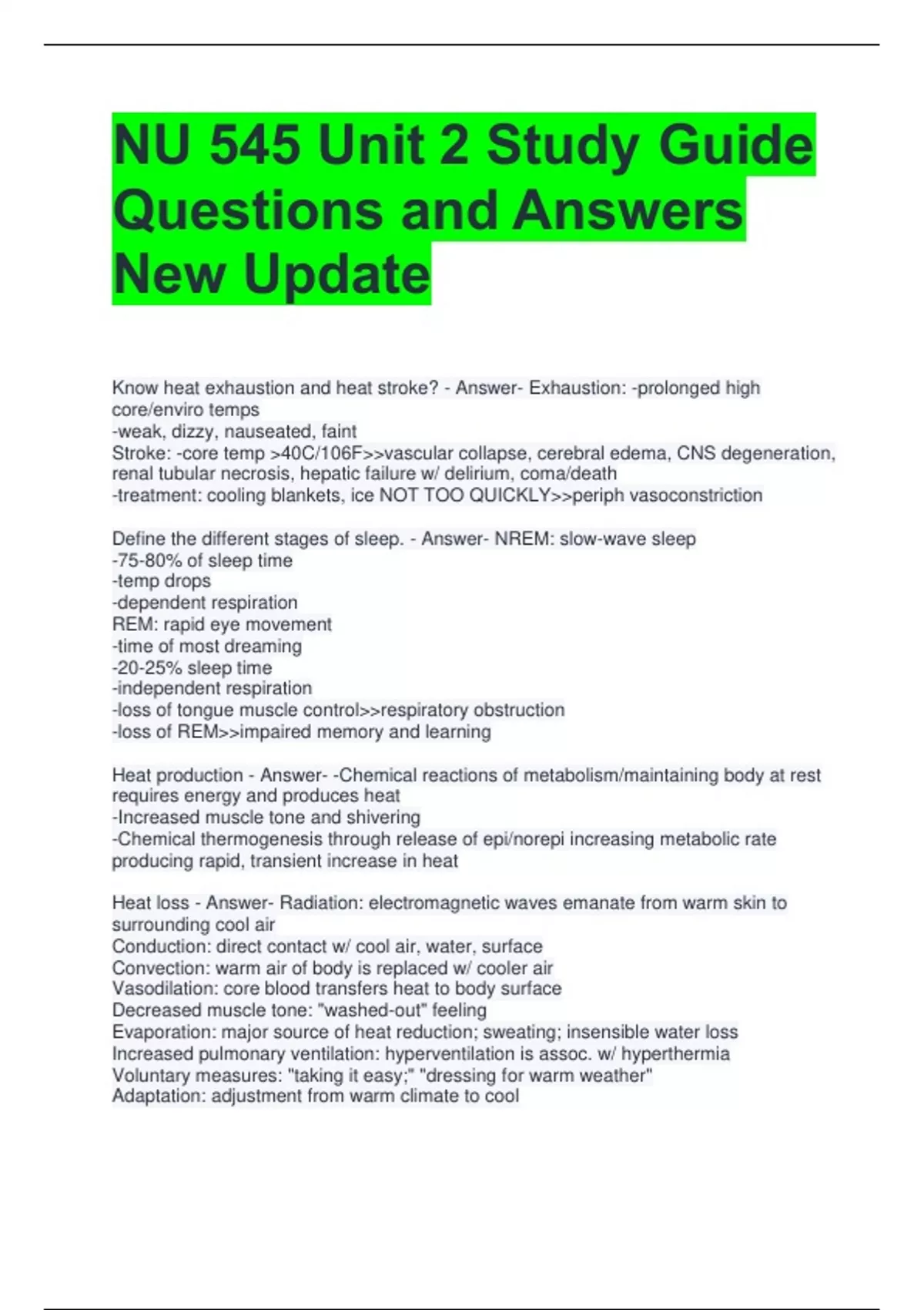 NU 545 Unit 2 Study Guide Questions and Answers New Update Know heat exhaustion and heat stroke? - Answer- Exhaustion: -prolonged high core/enviro temps -weak, dizzy, nauseated, faint Stroke: -core temp >40C/106F>>vascular collapse, cerebral edema, CNS degeneration, renal tubular necrosis, hepatic failure w/ delirium, coma/death -treatment: cooling blankets, ice NOT TOO QUICKLY>>periph vasoconstriction Define the different stages of sleep. - Answer- NREM: slow-wave sleep -75-80% of sleep time -temp drops -dependent respiration REM: rapid eye movement -time of most dreaming -20-25% sleep time -independent respiration -loss of tongue muscle control>>respiratory obstruction -loss of REM>>impaired memory and learning Heat production - Answer- -Chemical reactions of metabolism/maintaining body at rest requires energy and produces heat -Increased muscle tone and shivering -Chemical thermogenesis through release of epi/norepi increasing metabolic rate producing rapid, transient increase in heat Heat loss - Answer- Radiation: electromagnetic waves emanate from warm skin to surrounding cool air Conduction: direct contact w/ cool air, water, surface Convection: warm air of body is replaced w/ cooler air Vasodilation: core blood transfers heat to body surface Decreased muscle tone: "washed-out" feeling Evaporation: major source of heat reduction; sweating; insensible water loss Increased pulmonary ventilation: hyperventilation is assoc. w/ hyperthermia Voluntary measures: "taking it easy;" "dressing for warm weather" Adaptation: adjustment from warm climate to cool