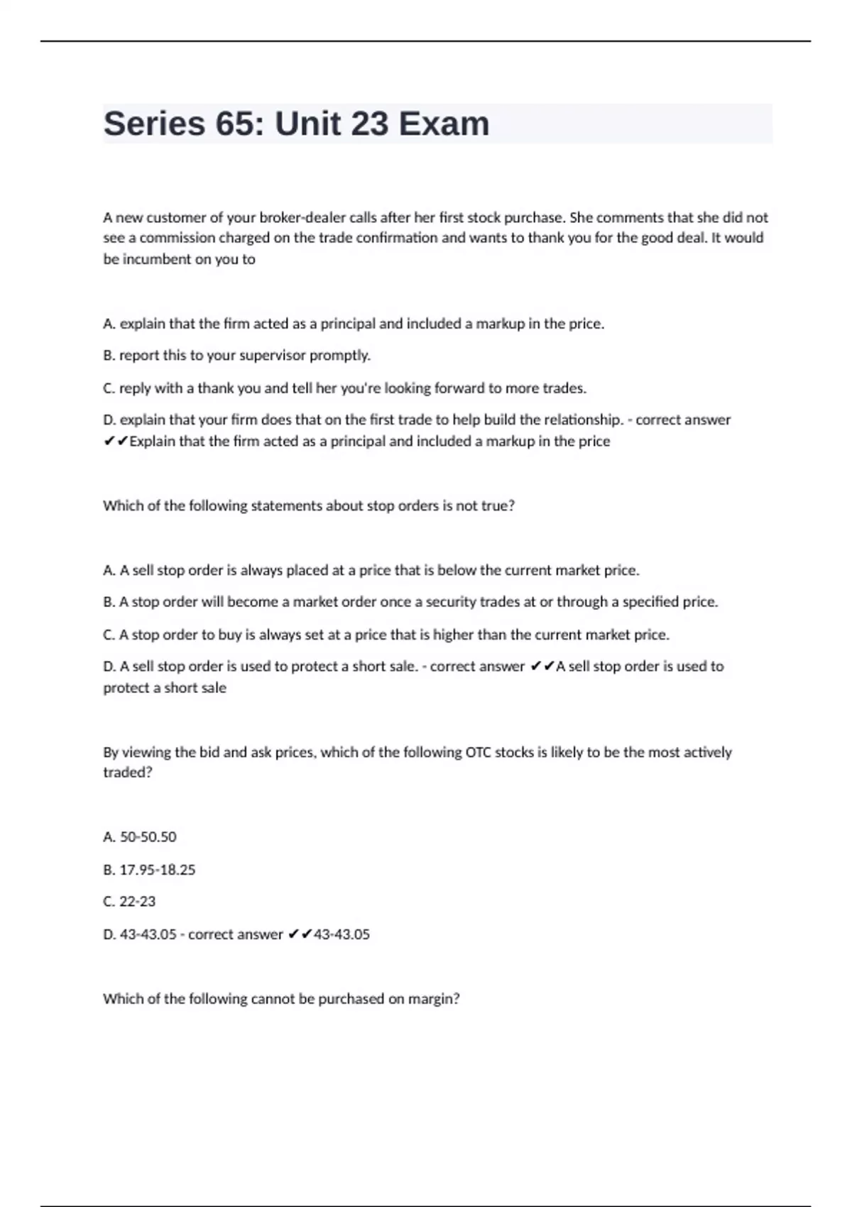D. Selling the stock short - correct answer ✔✔Buying the stock on margin