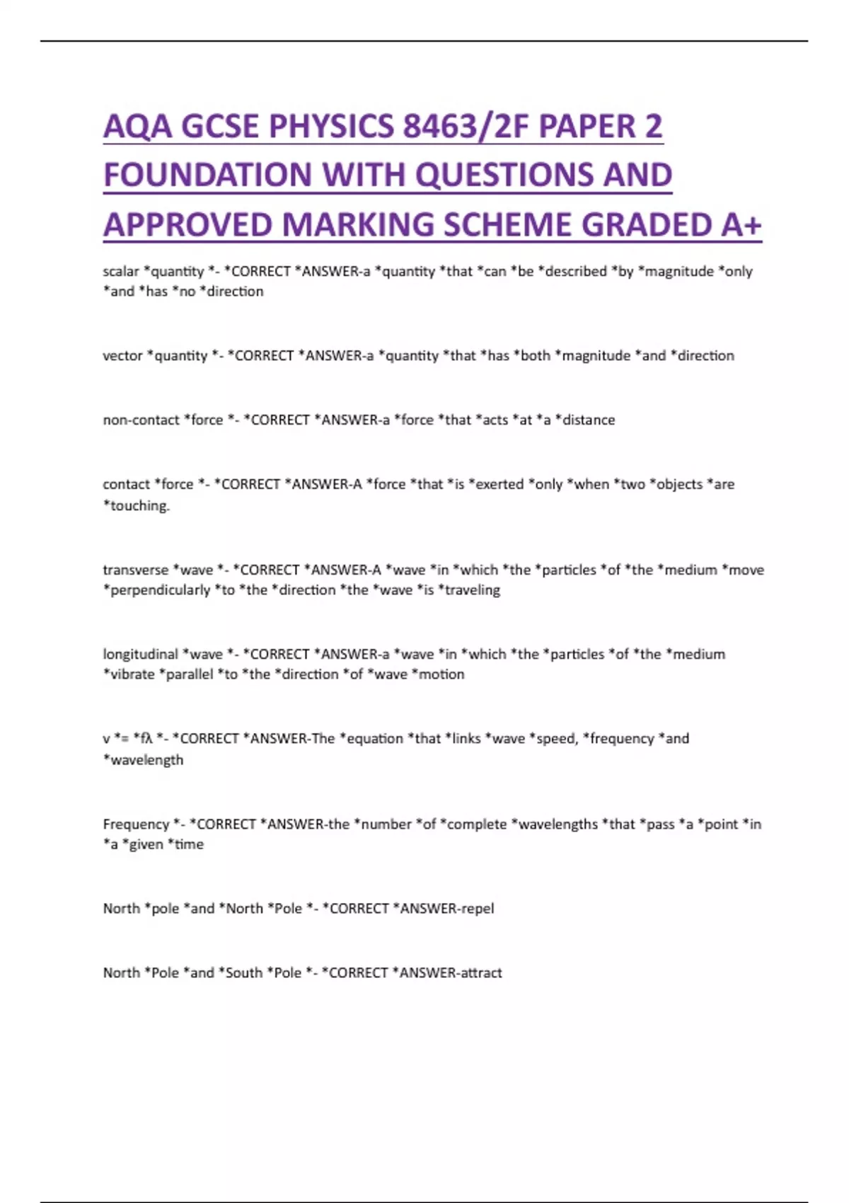 scalar *quantity *- *CORRECT *ANSWER-a *quantity *that *can *be *described *by *magnitude *only *and *has *no *direction vector *quantity *- *CORRECT *ANSWER-a *quantity *that *has *both *magnitude *and *direction non-contact *force *- *CORRECT *ANSWER-a *force *that *acts *at *a *distance contact *force *- *CORRECT *ANSWER-A *force *that *is *exerted *only *when *two *objects *are *touching. transverse *wave *- *CORRECT *ANSWER-A *wave *in *which *the *particles *of *the *medium *move *perpendicularly *to *the *direction *the *wave *is *traveling longitudinal *wave *- *CORRECT *ANSWER-a *wave *in *which *the *particles *of *the *medium *vibrate *parallel *to *the *direction *of *wave *motion v *= *fλ *- *CORRECT *ANSWER-The *equation *that *links *wave *speed, *frequency *and *wavelength Frequency *- *CORRECT *ANSWER-the *number *of *complete *wavelengths *that *pass *a *point *in *a *given *time North *pole *and *North *Pole *- *CORRECT *ANSWER-repel North *Pole *and *South *Pole *- *CORRECT *ANSWER-attract Horizontal *line *on *a *distance *time *graph *- *CORRECT *ANSWER-The *object *is *stationary