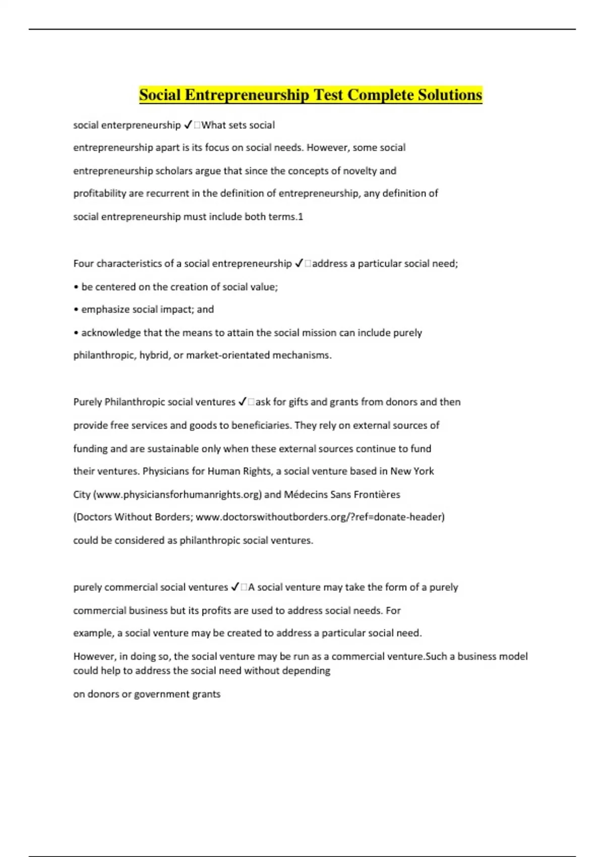Social Entrepreneurship Test Complete Solutions social enterpreneurship ️What sets social entrepreneurship apart is its focus on social needs. However, some social entrepreneurship scholars argue that since the concepts of novelty and profitability are recurrent in the definition of entrepreneurship, any definition of social entrepreneurship must include both terms.1 Four characteristics of a social entrepreneurship ️address a particular social need; • be centered on the creation of social value; • emphasize social impact; and • acknowledge that the means to attain the social mission can include purely philanthropic, hybrid, or market-orientated mechanisms. Purely Philanthropic social ventures ️ask for gifts and grants from donors and then provide free services and goods to beneficiaries. They rely on external sources of funding and are sustainable only when these external sources continue to fund their ventures. Physicians for Human Rights, a social venture based in New York City () and Médecins Sans Frontières (Doctors Without Borders; could be considered as philanthropic social ventures. purely commercial social ventures ️A social venture may take the form of a purely commercial business but its profits are used to address social needs. For example, a social venture may be created to address a particular social need. However, in doing so, the social venture may be run as a commercial venture.Such a business model could help to address the social need without depending on donors or government grants hybrid social ventures ️both social value creation and economic value creation are core organizational activities. Hence, a social enterprise that combines the organizational forms of both business and charity at its core is an ideal type of hybrid organization. McGrath and MacMillan define the entrepreneurial mindset as a way of thinking about business that captures the benefits of uncertainty and contend that the entrepreneurial mindset takes hold when the following five characteristics are displayed: ️passionate pursuit of opportunities; • pursuit of opportunities with discipline; • pursuit of only the best opportunities; • a focus on adaptive execution; and • engagement with the energies of everyone.1 The literature on the entrepreneurial mindset could lead to the identification of four key elements ️entrepreneurial thoughts; • entrepreneurial choices; • entrepreneurial actions; and • entrepreneurial outcomes. Dees, who was an early social entrepreneur scholar determined that the role of change in the social sector change agents by ️adopting a mission to create and sustain social value (not just private value); • recognizing and relentlessly pursuing new opportunities to serve that mission; • engaging in a process of continuous innovation, adaptation, and learning; • acting boldly without being limited by current resources; and • exhibiting heightened accountability to the constituencies served and the