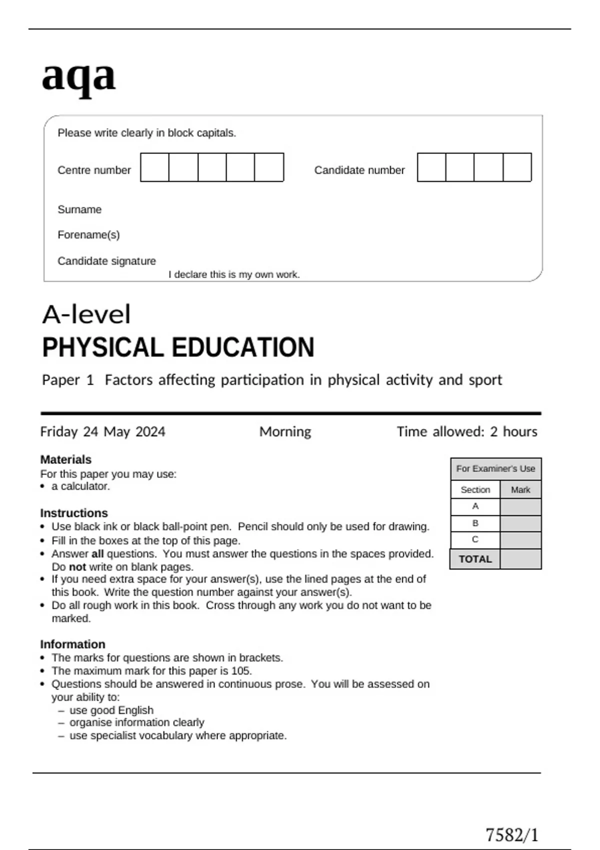 The maximum mark for this paper is 105.