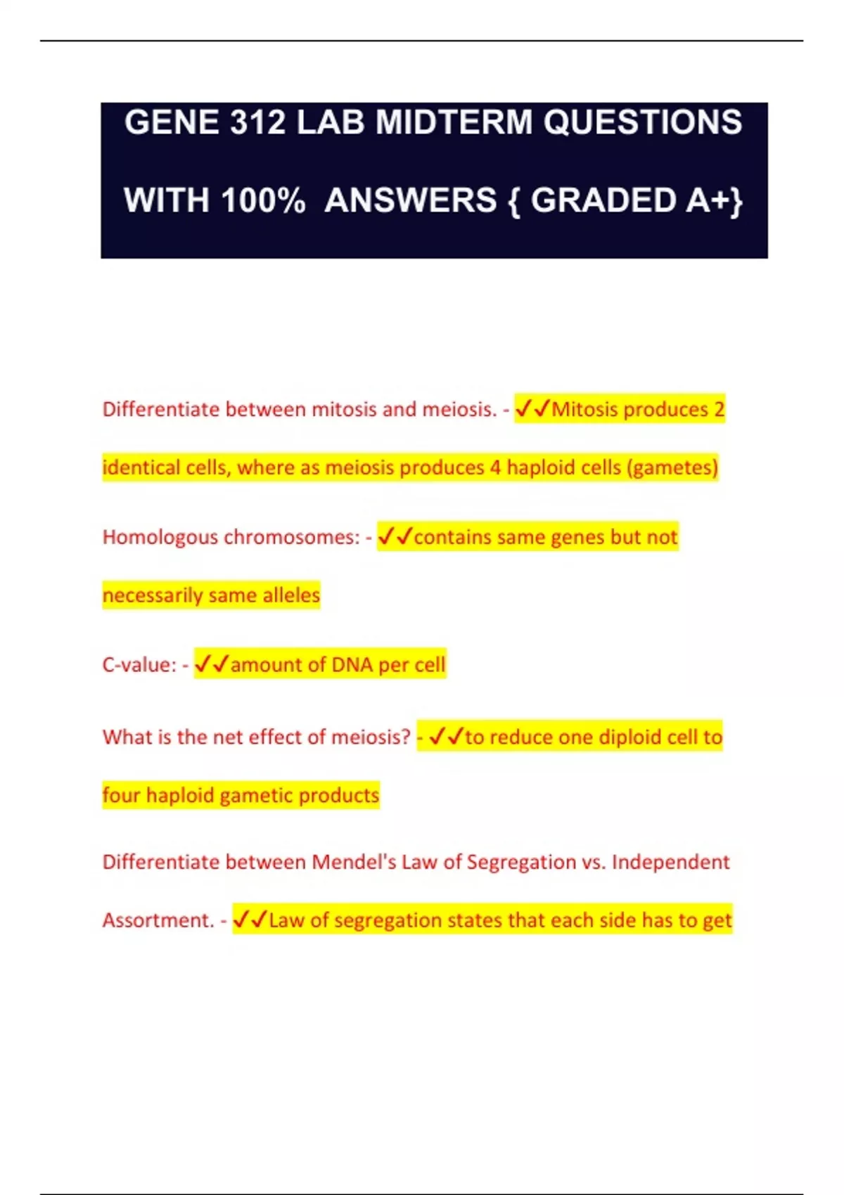 GENE 312 LAB MIDTERM QUESTIONS WITH 100% ANSWERS { GRADED A+} Differentiate between mitosis and meiosis. - Mitosis produces 2 identical cells, where as meiosis produces 4 haploid cells (gametes) Homologous chromosomes: - contains same genes but not necessarily same alleles C-value: - amount of DNA per cell What is the net effect of meiosis? - to reduce one diploid cell to four haploid gametic products Differentiate between Mendel's Law of Segregation vs. Independent Assortment. - Law of segregation states that each side has to get