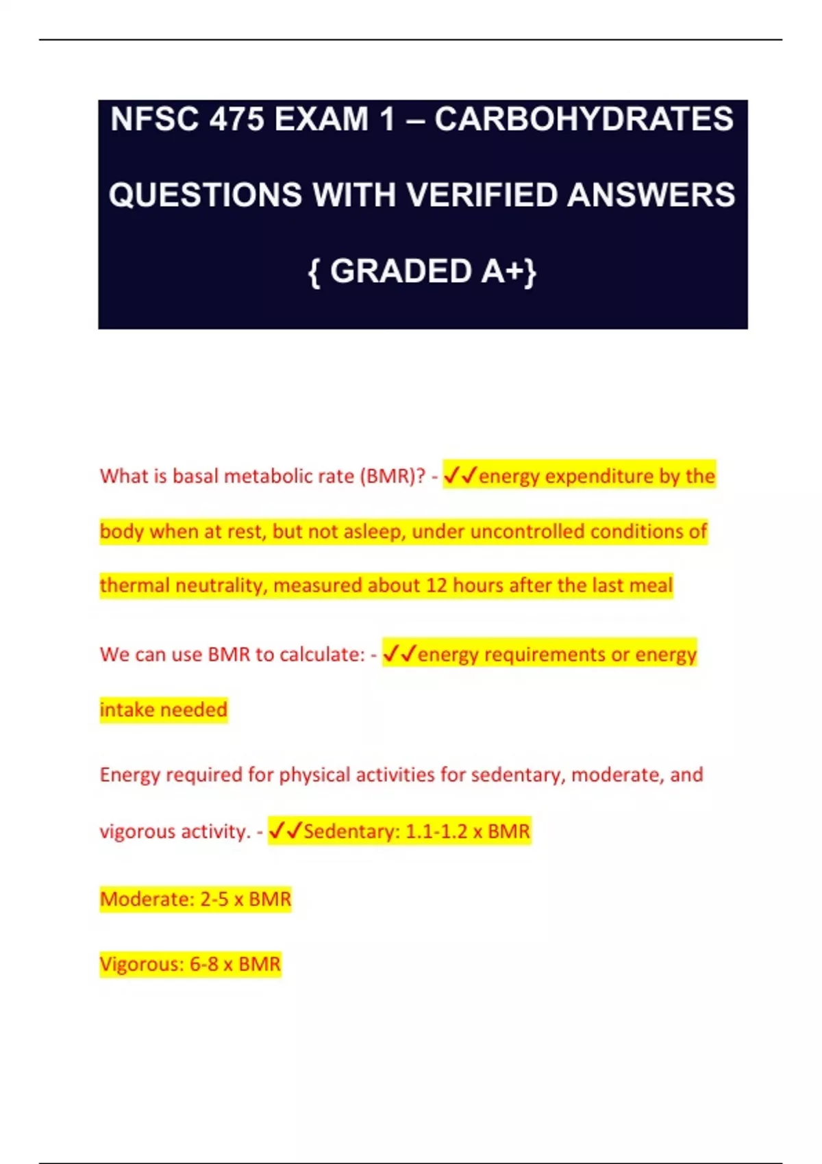 NFSC 475 EXAM 1 – CARBOHYDRATES QUESTIONS WITH VERIFIED ANSWERS { GRADED A+} What is basal metabolic rate (BMR)? - energy expenditure by the body when at rest, but not asleep, under uncontrolled conditions of thermal neutrality, measured about 12 hours after the last meal We can use BMR to calculate: - energy requirements or energy intake needed Energy required for physical activities for sedentary, moderate, and vigorous activity. - Sedentary: 1.1-1.2 x BMR Moderate: 2-5 x BMR Vigorous: 6-8 x BMR